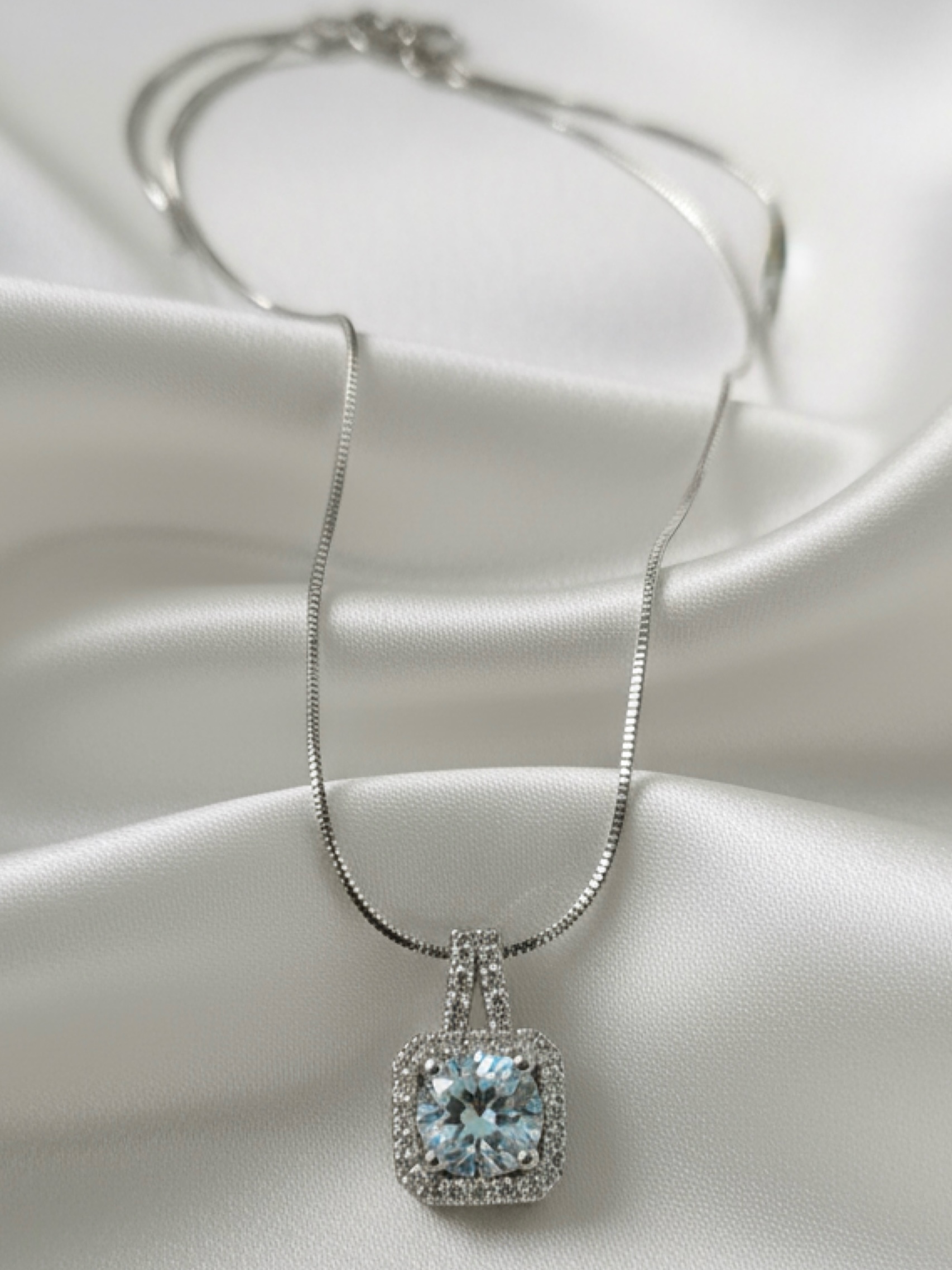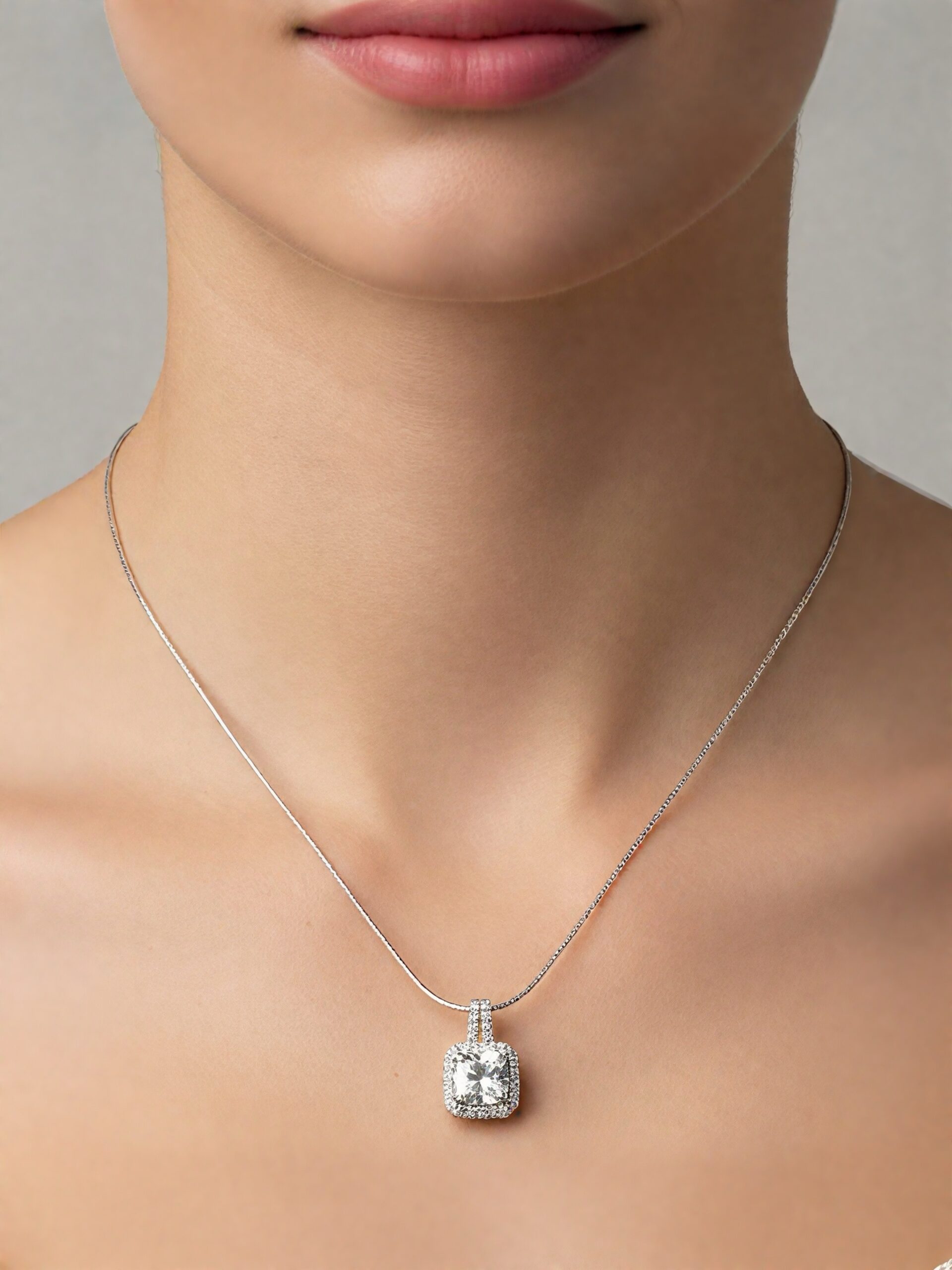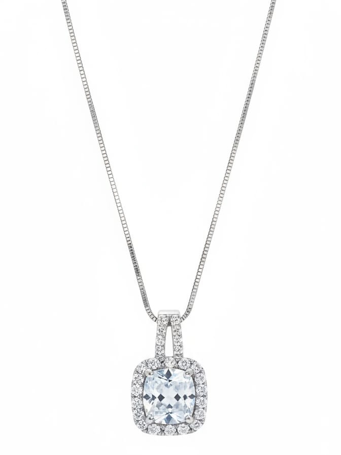 Elevate any look with this elegant pendant necklace featuring a cushion-cut central stone surrounded by a halo of shimmering pavé accents, all set in a polished silver frame. Perfect for both everyday wear and special occasions, this piece adds timeless sophistication and radiant brilliance.