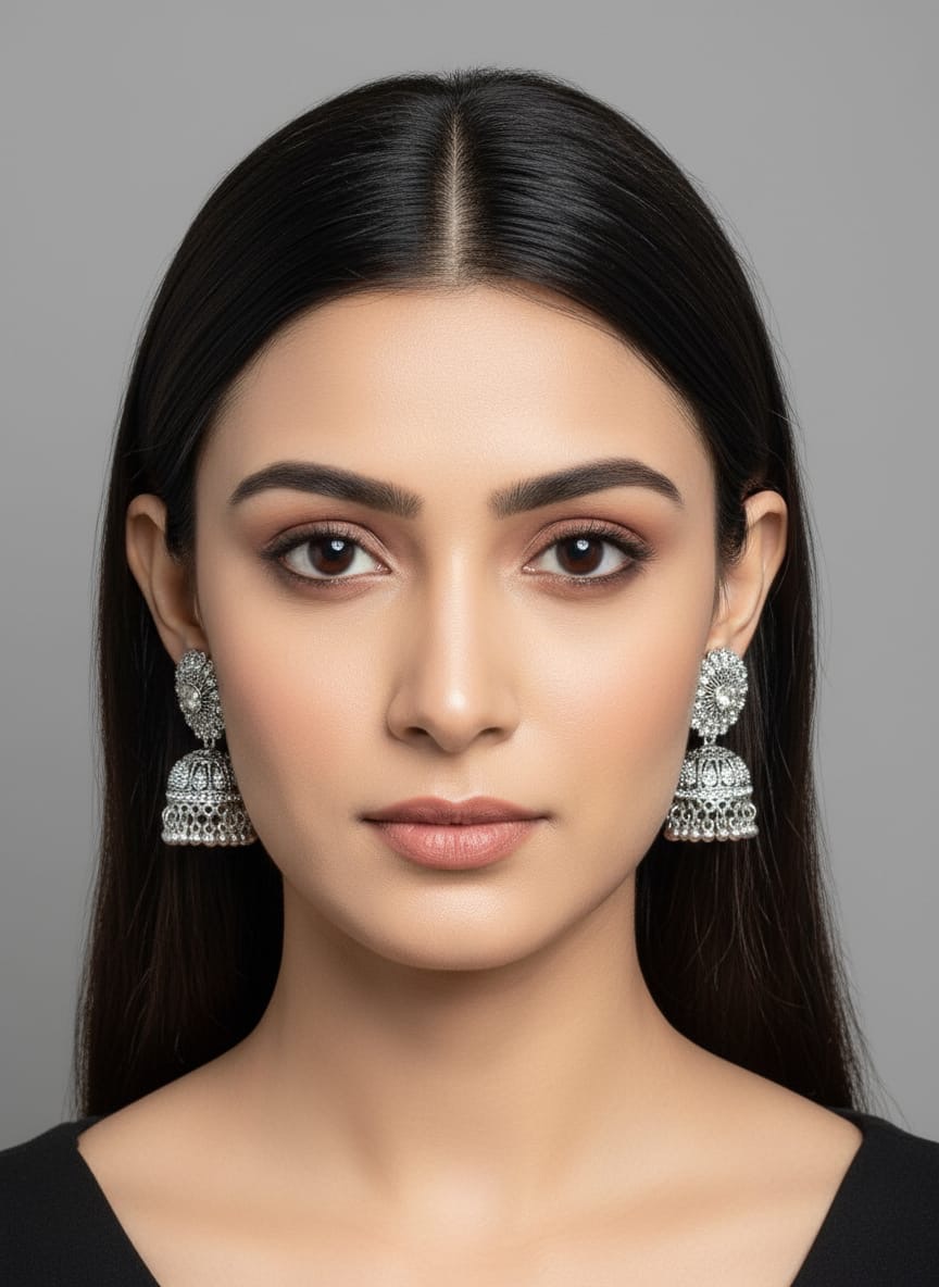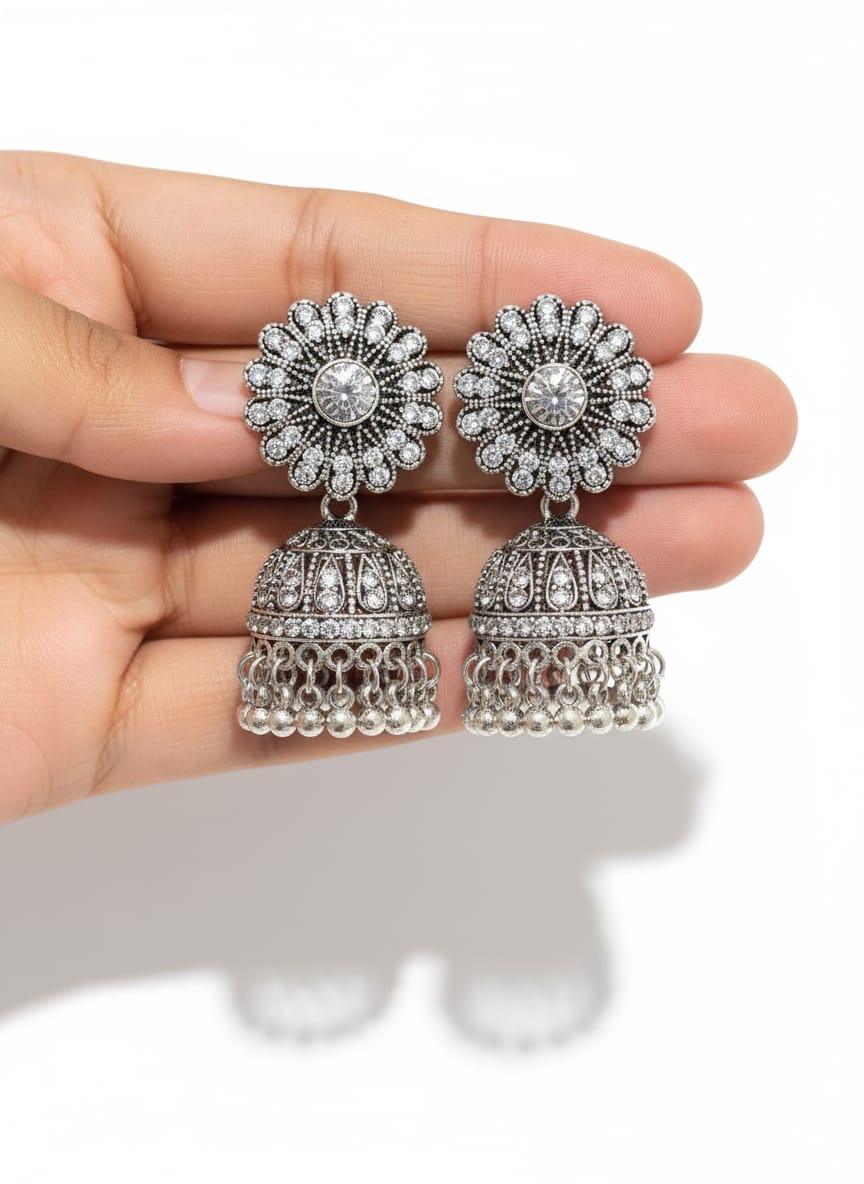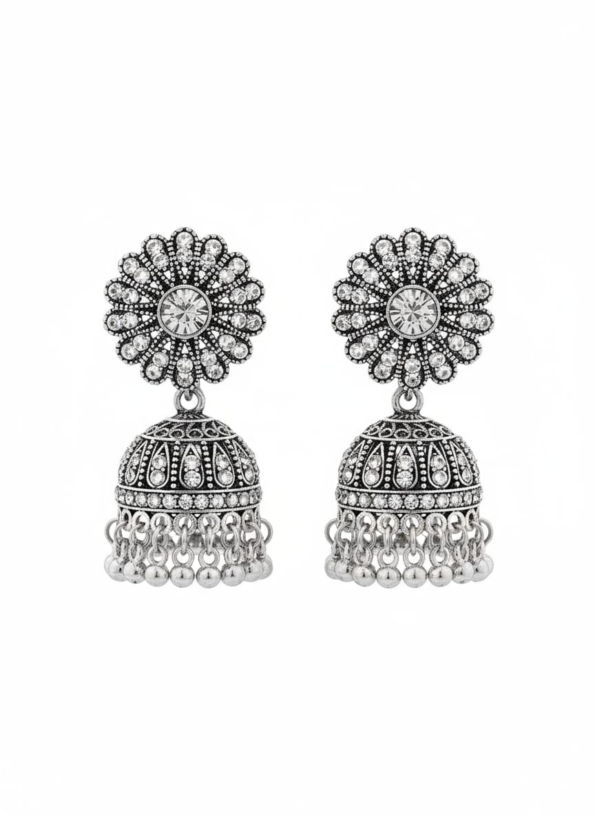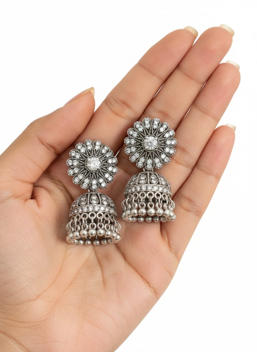 Embrace timeless tradition with these antique silver jhumka earrings, featuring intricate floral motifs, sparkling white stones, and delicate bead danglings. Perfect for festive occasions or ethnic ensembles, these earrings showcase classic craftsmanship with a modern finish to elevate your jewelry collection.