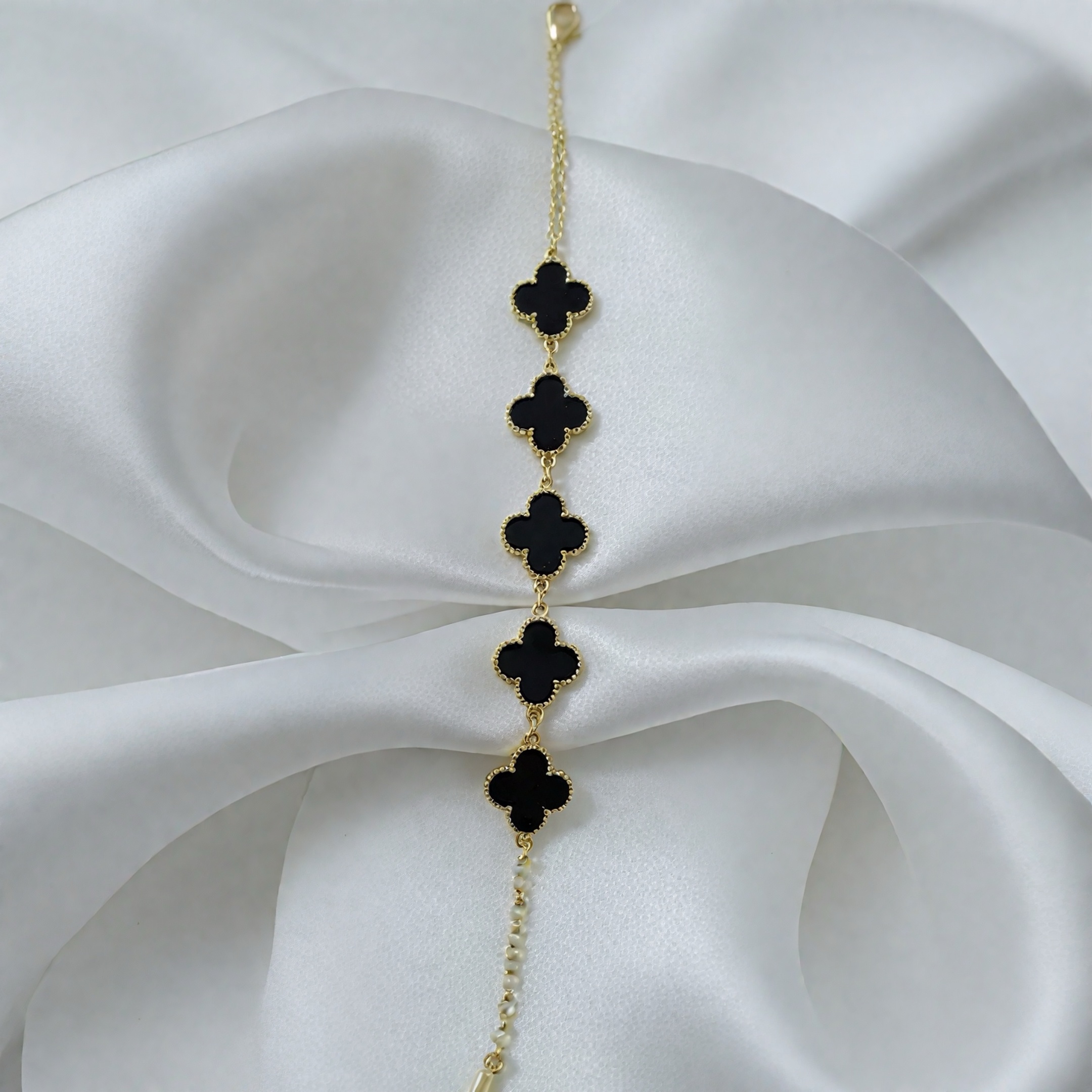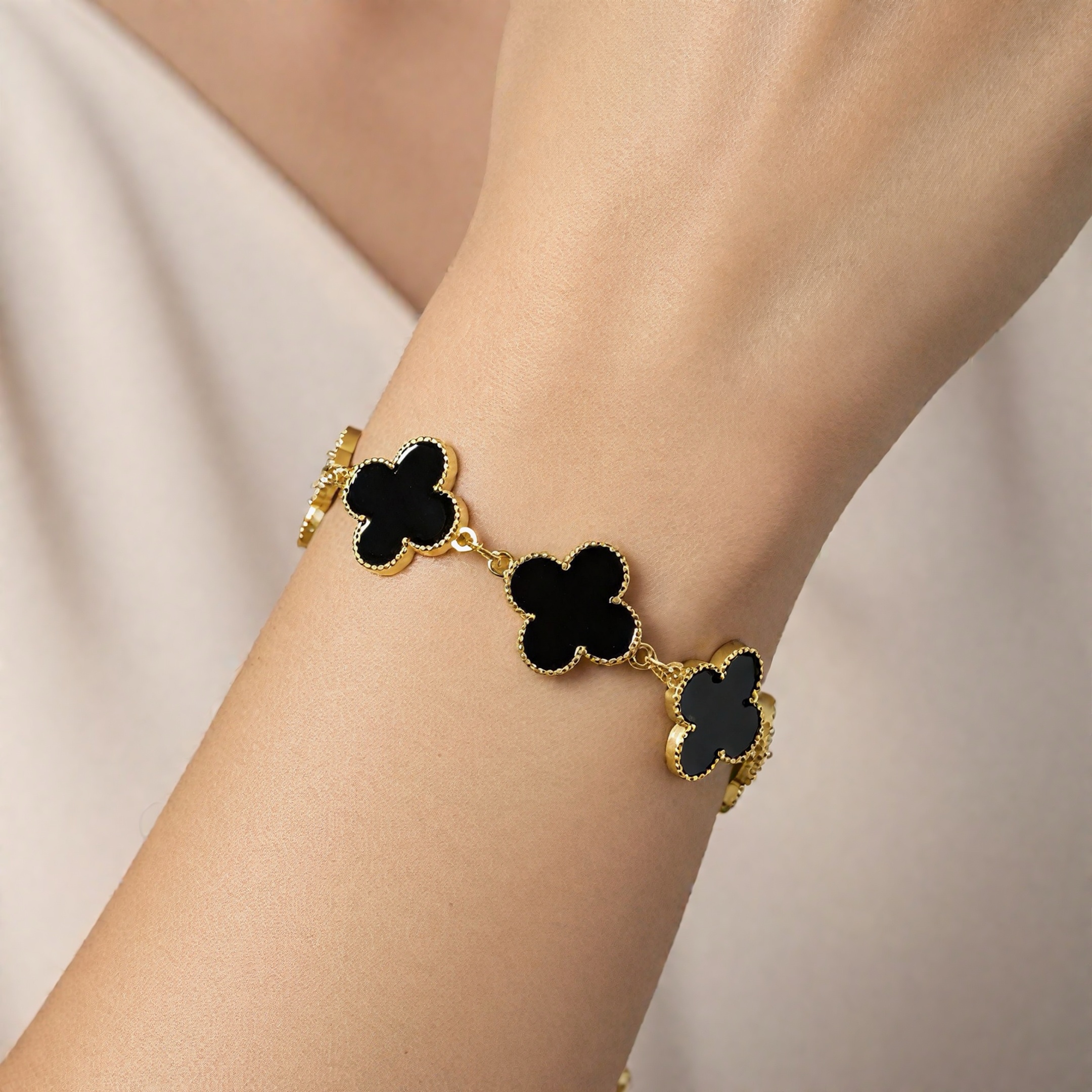 This Elegant Black Clover Drop Chain Bracelet is a statement piece that blends modern luxury with timeless charm. Designed with a vertical arrangement of black clover-shaped motifs, each outlined in a delicate gold-tone border, this bracelet offers a striking contrast that looks both bold and sophisticated.