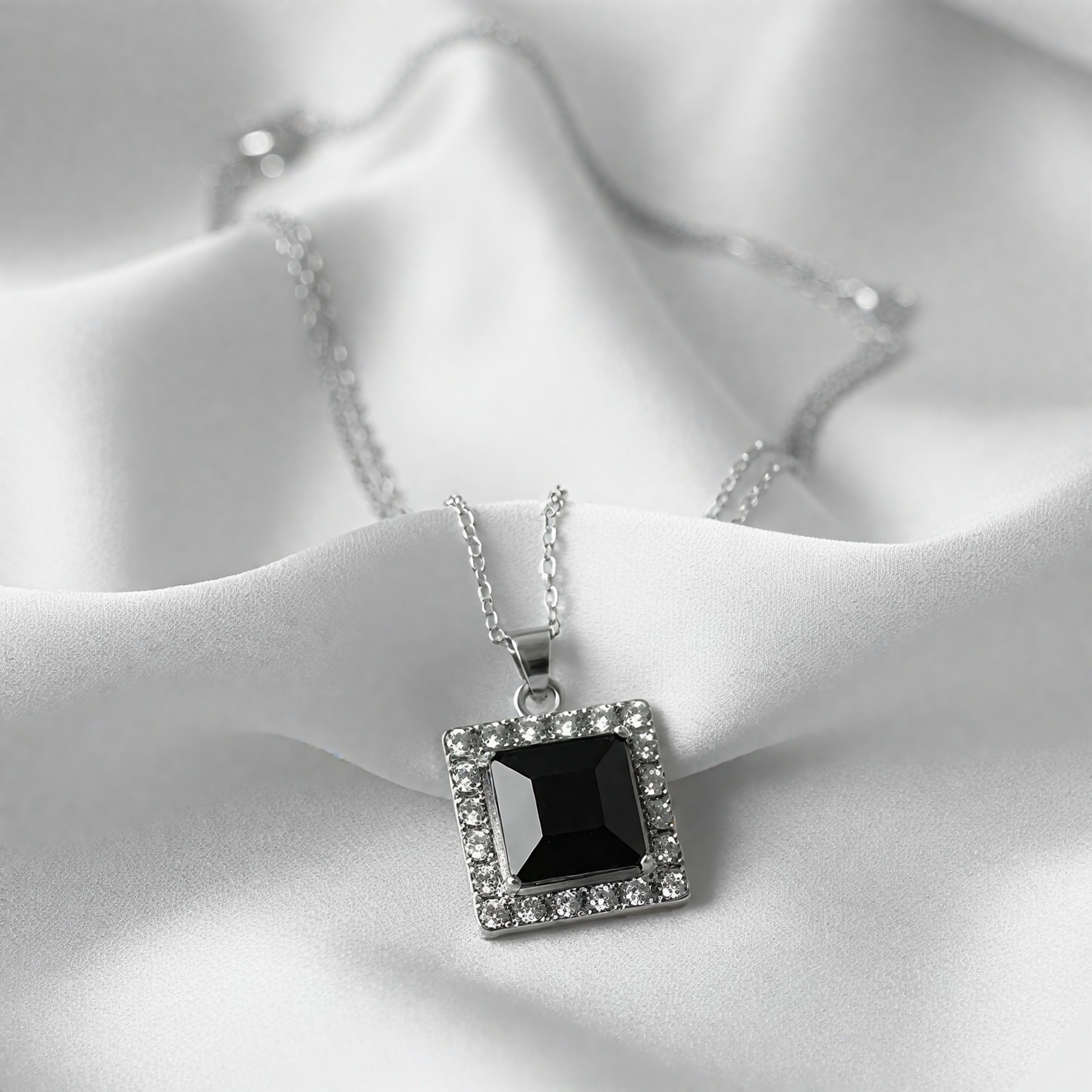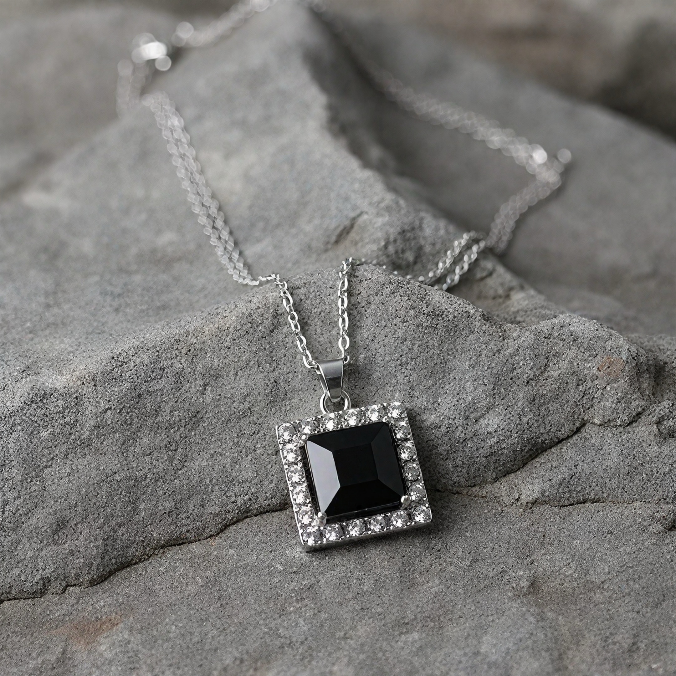 This Midnight Elegance Black Stone Square Pendant Necklace is a perfect blend of modern style and timeless sophistication. The pendant features a bold square-cut black stone at the center, beautifully framed by a border of sparkling crystal accents that add a refined shine.