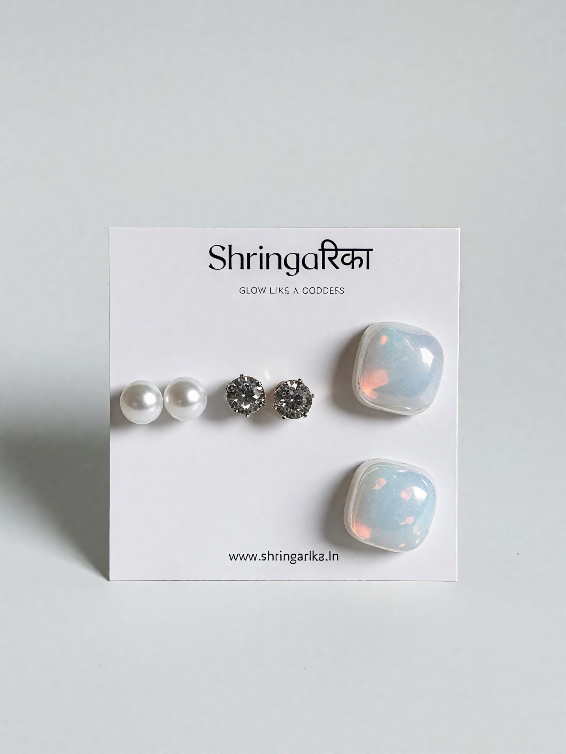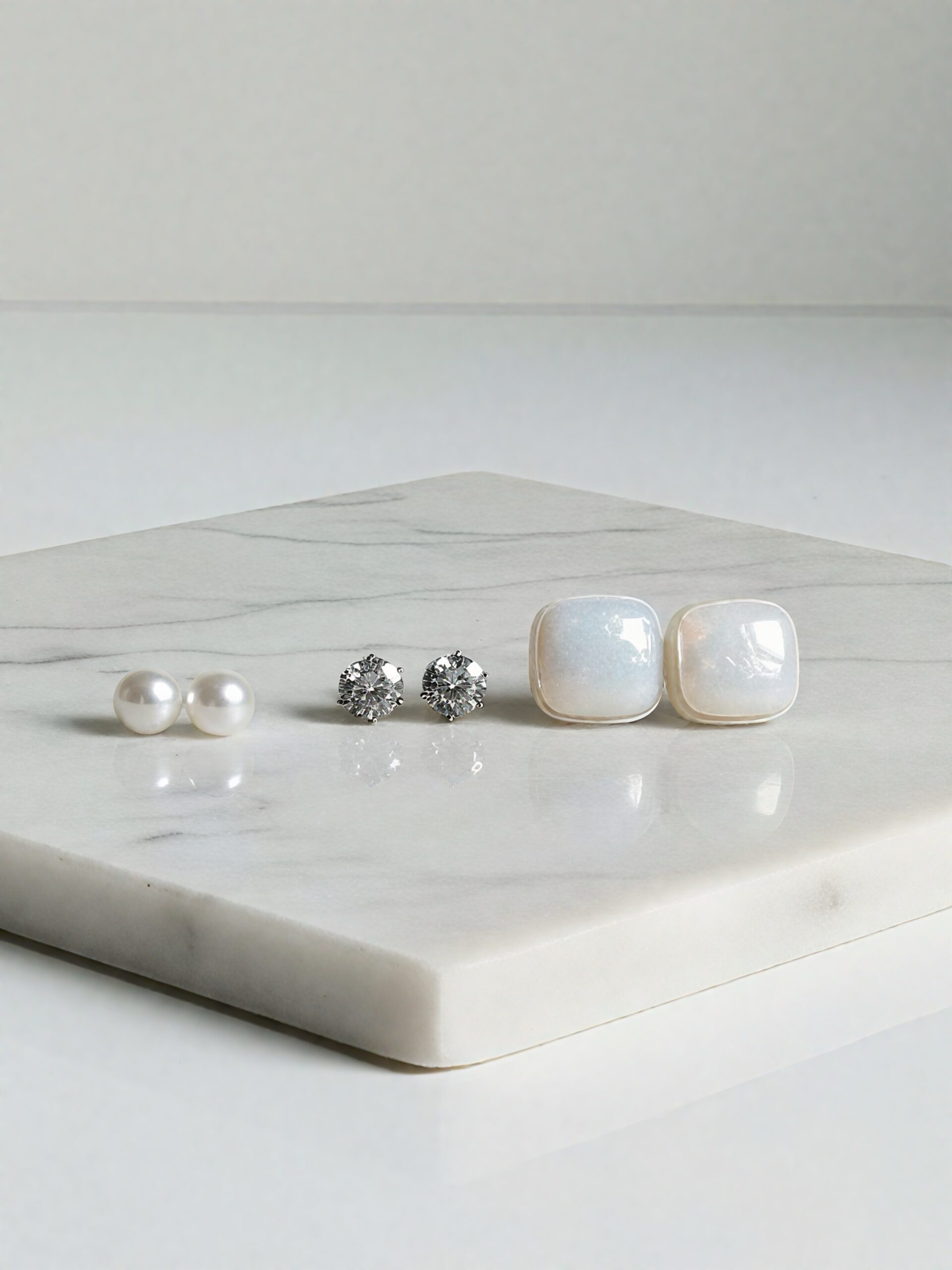 This classic stud earrings set features three distinct pairs—timeless pearl studs, sparkling cubic zirconia studs, and elegant mother-of-pearl square studs. Each pair is thoughtfully crafted for everyday elegance, offering versatile options to complement both casual and formal looks. The pearls provide a touch of sophistication, the cubic zirconia offers brilliant sparkle, and the mother-of-pearl studs add a modern yet refined appeal. Perfect as a gift or as an essentials kit for your own jewelry collection, this set ensures you have the right stud for every occasion.
