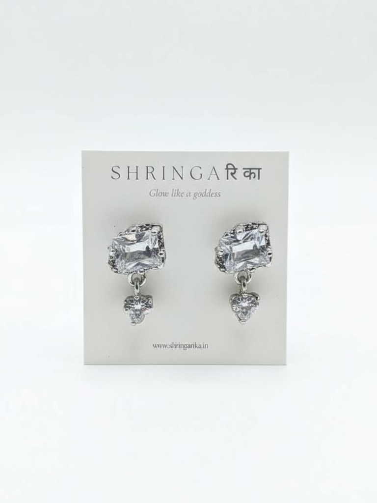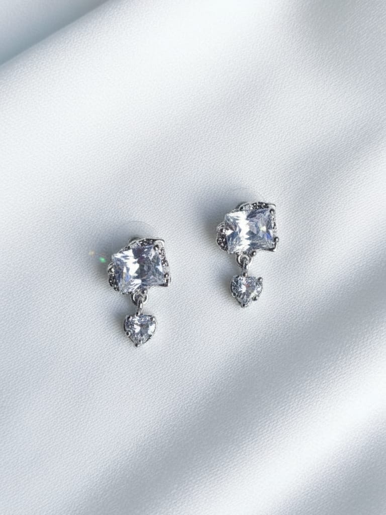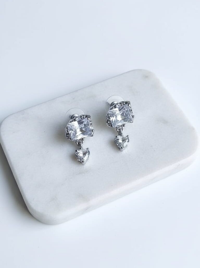 Elegant stud earrings featuring a sparkling square-cut crystal with a delicate heart-shaped crystal drop, set in a silver-tone mount for a timeless and sophisticated look—perfect for everyday elegance or special occasions.