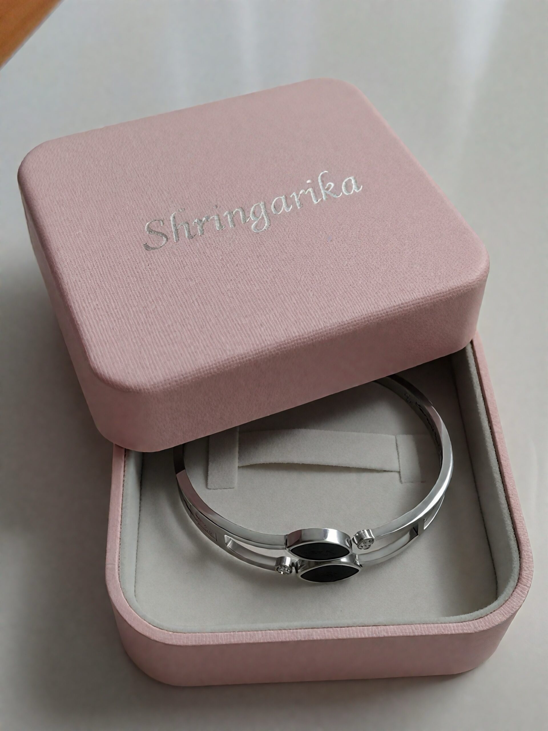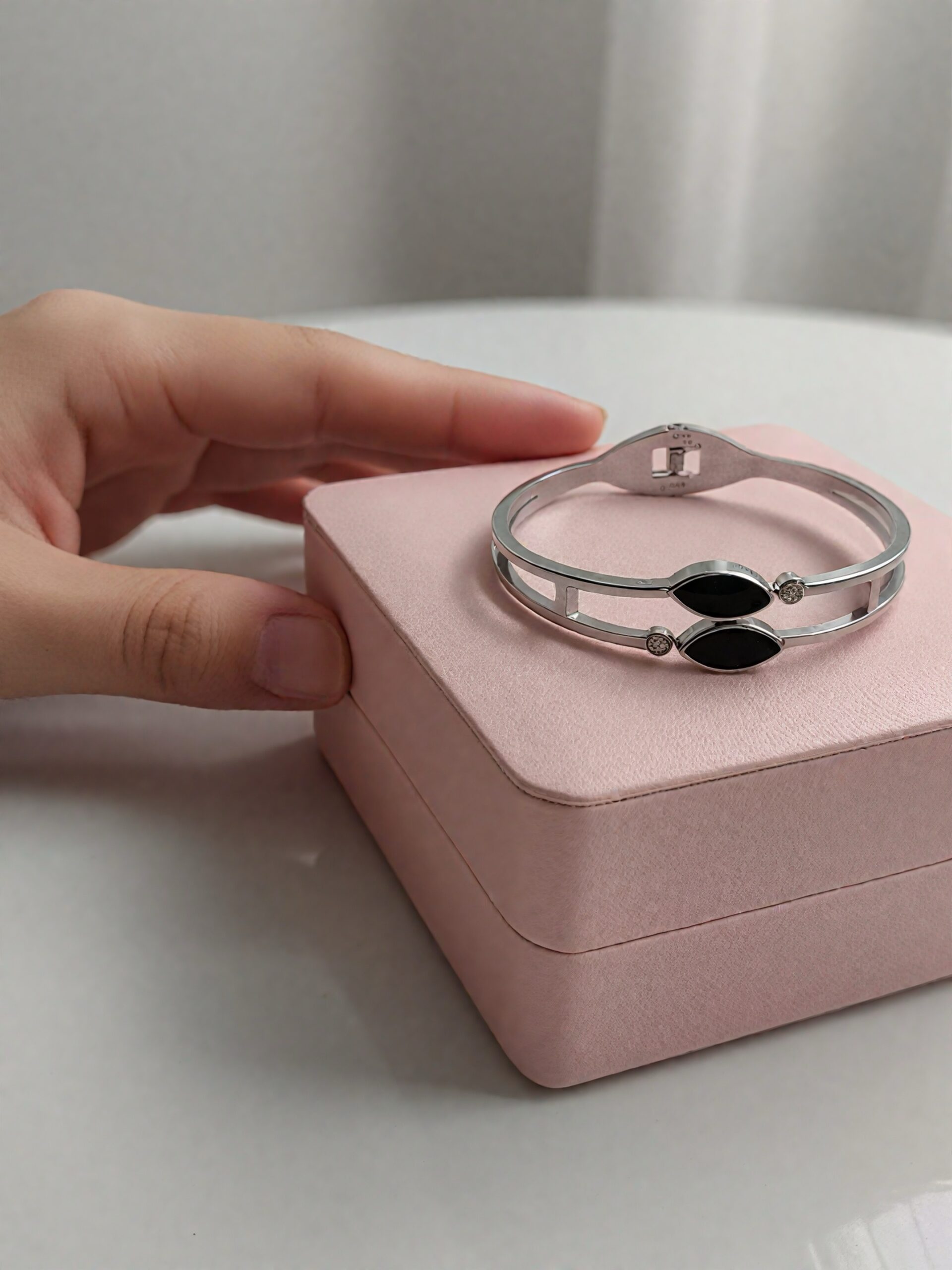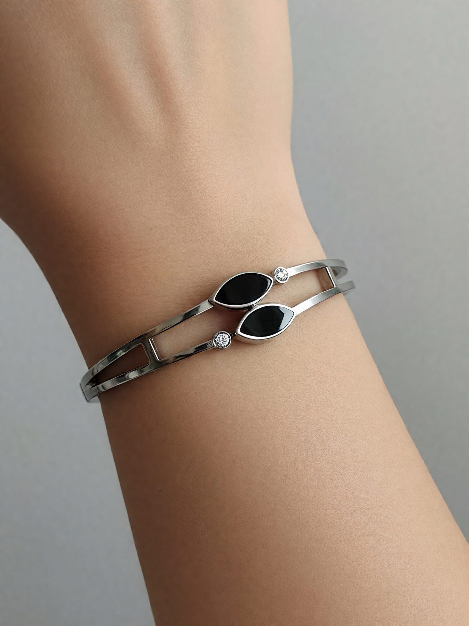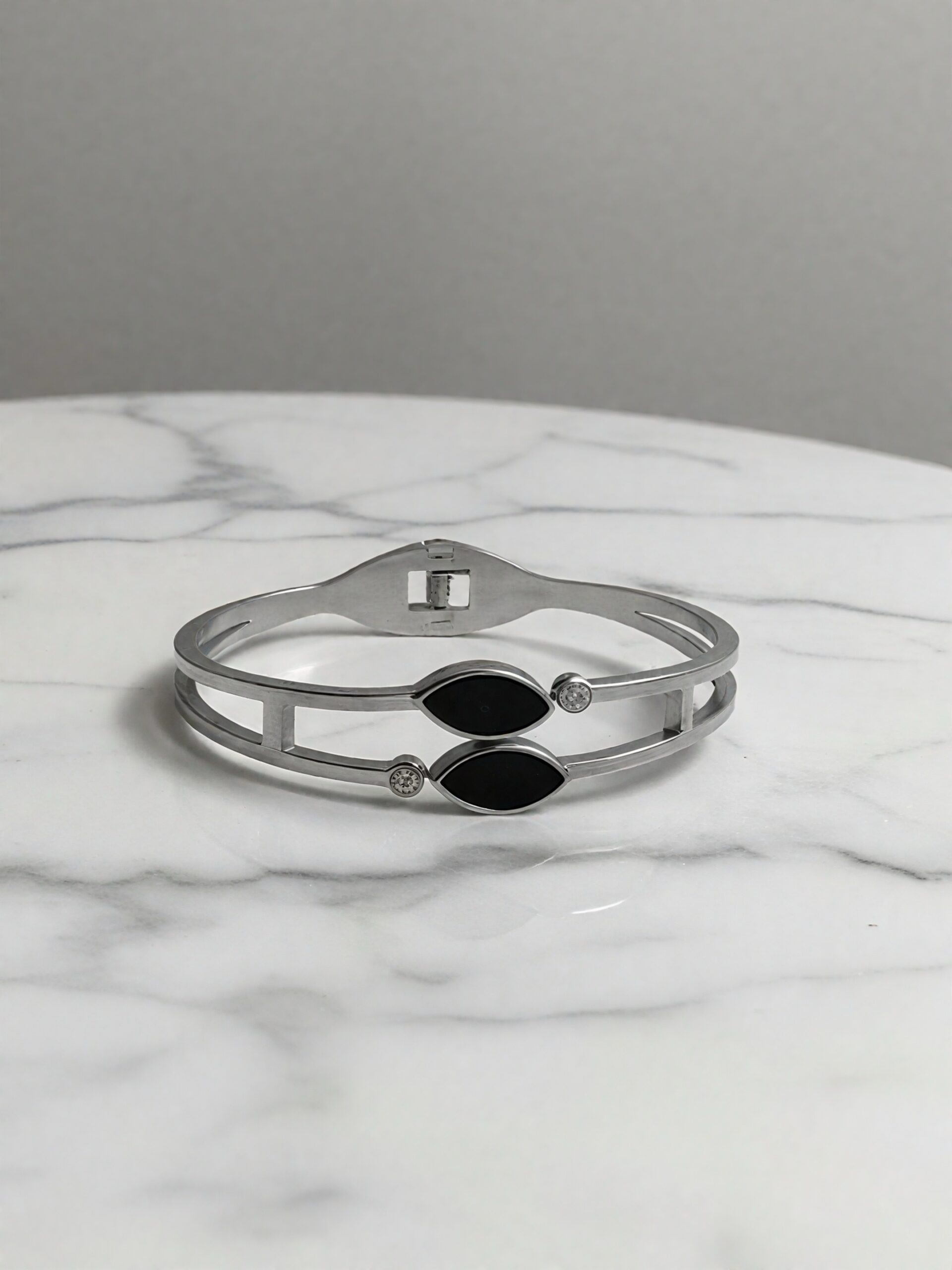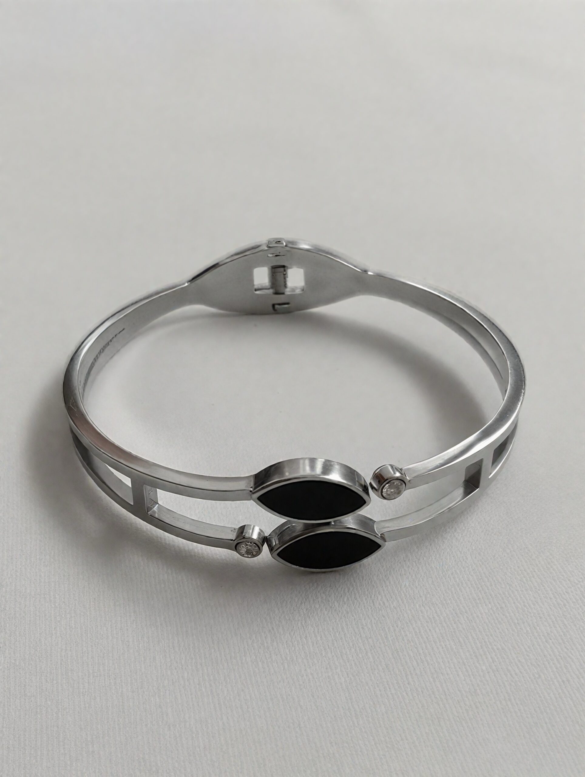 A sleek silver-toned bracelet featuring two marquise-shaped black stones accented with small crystal studs. Its modern open-frame design gives a stylish, minimal, and premium look—perfect for everyday wear or special occasions.
