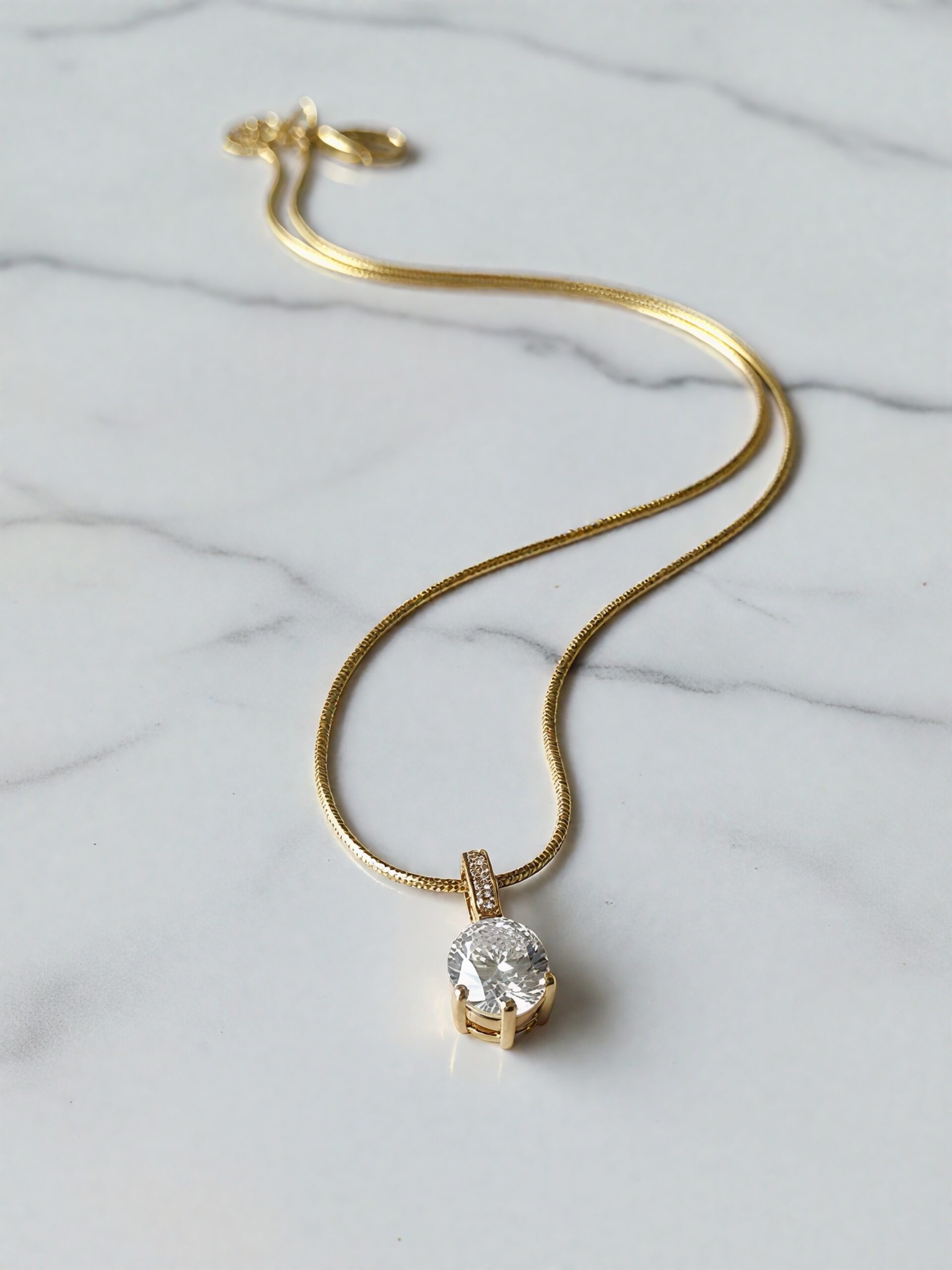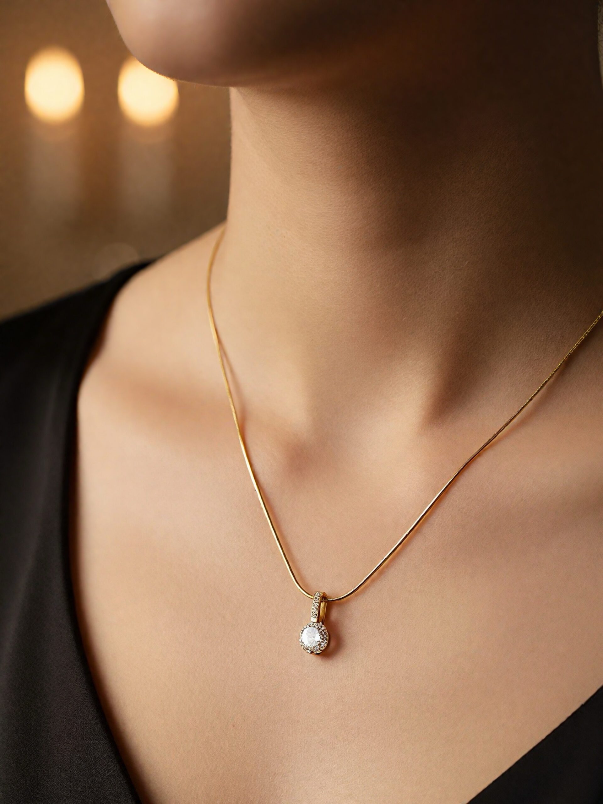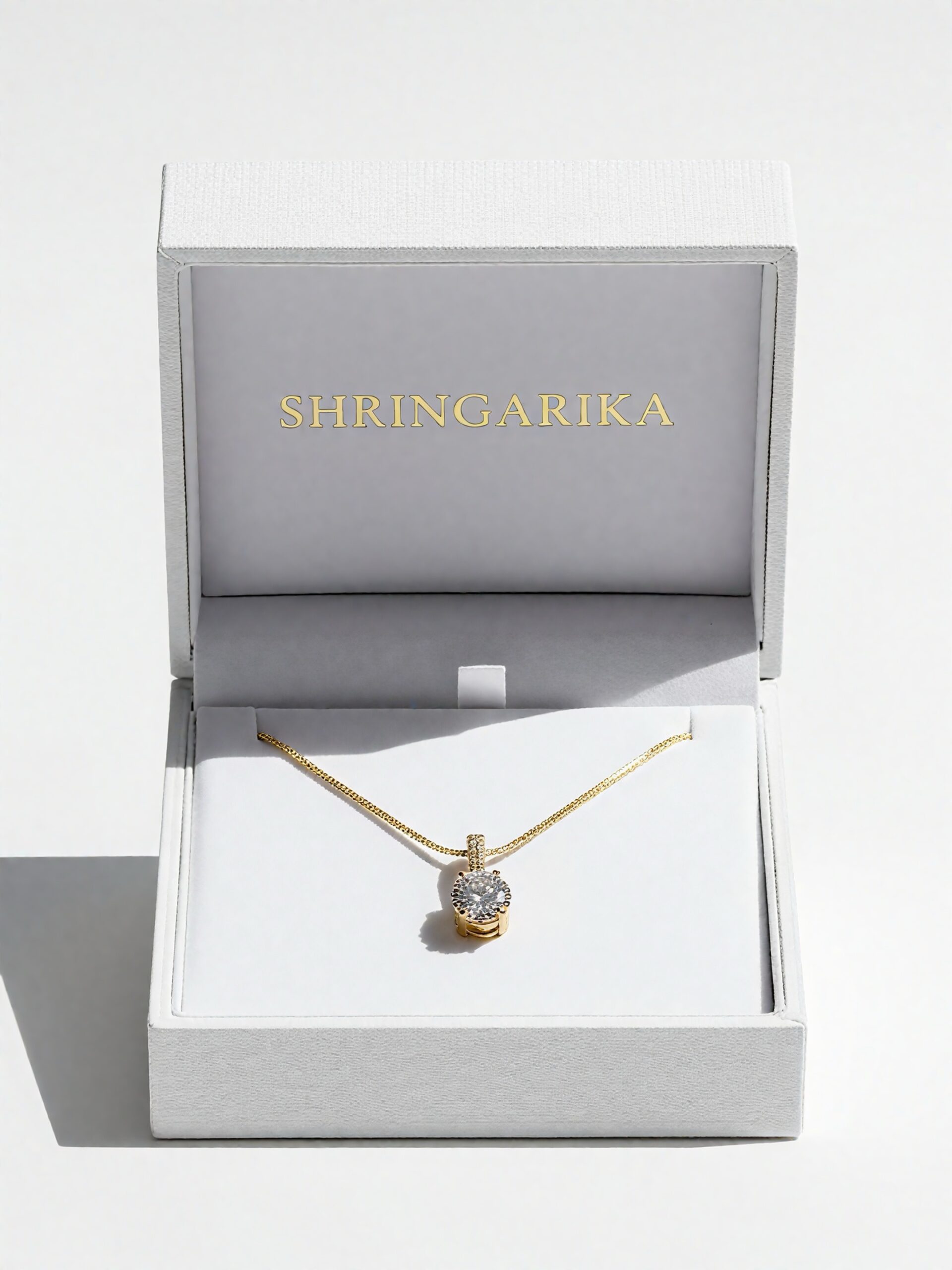 A sleek and minimalistic gold chain featuring a sparkling round solitaire pendant. The pendant is framed with delicate detailing, giving it a timeless and luxurious look. Perfect for formal events, evening wear, or everyday elegance.