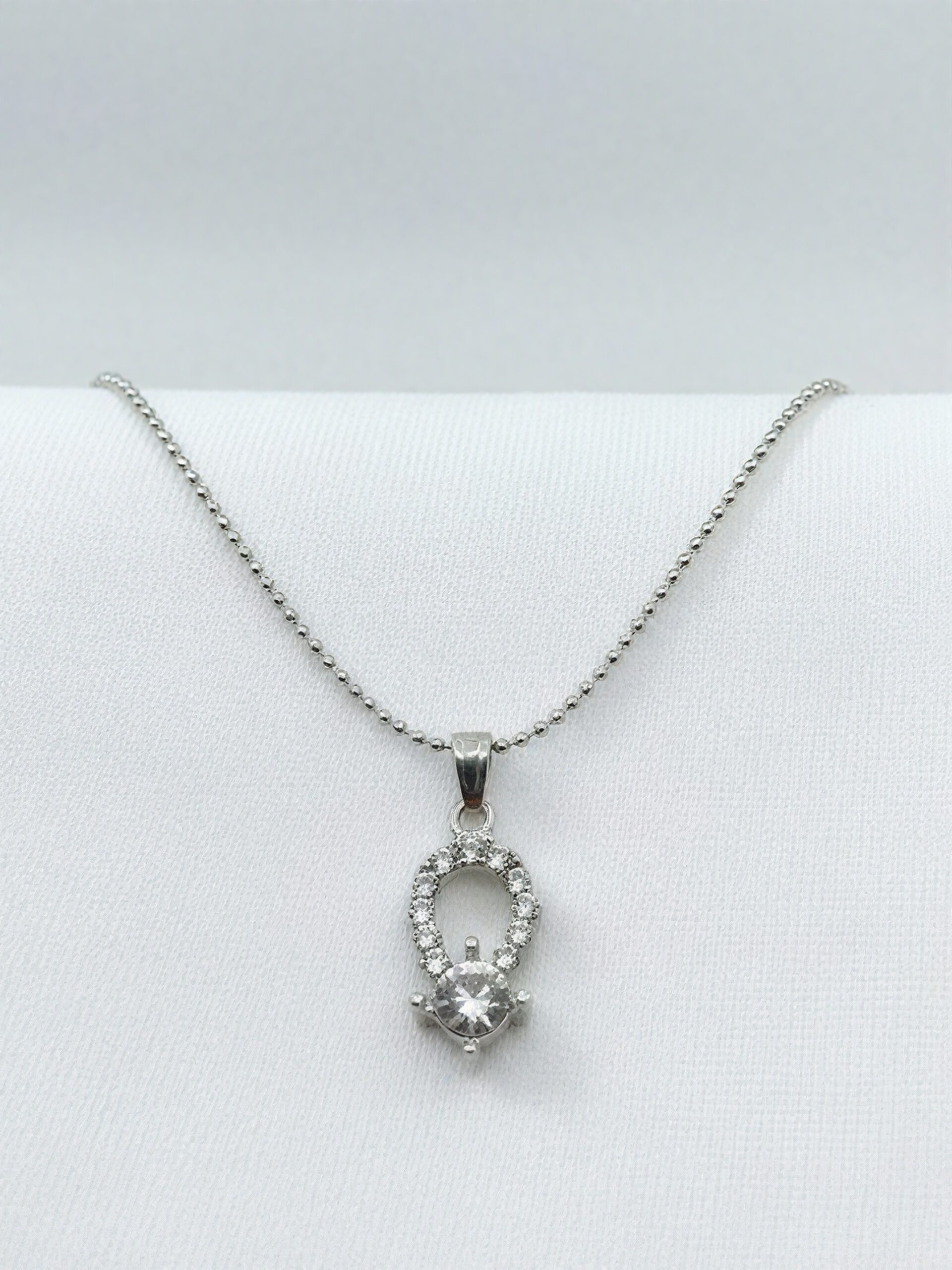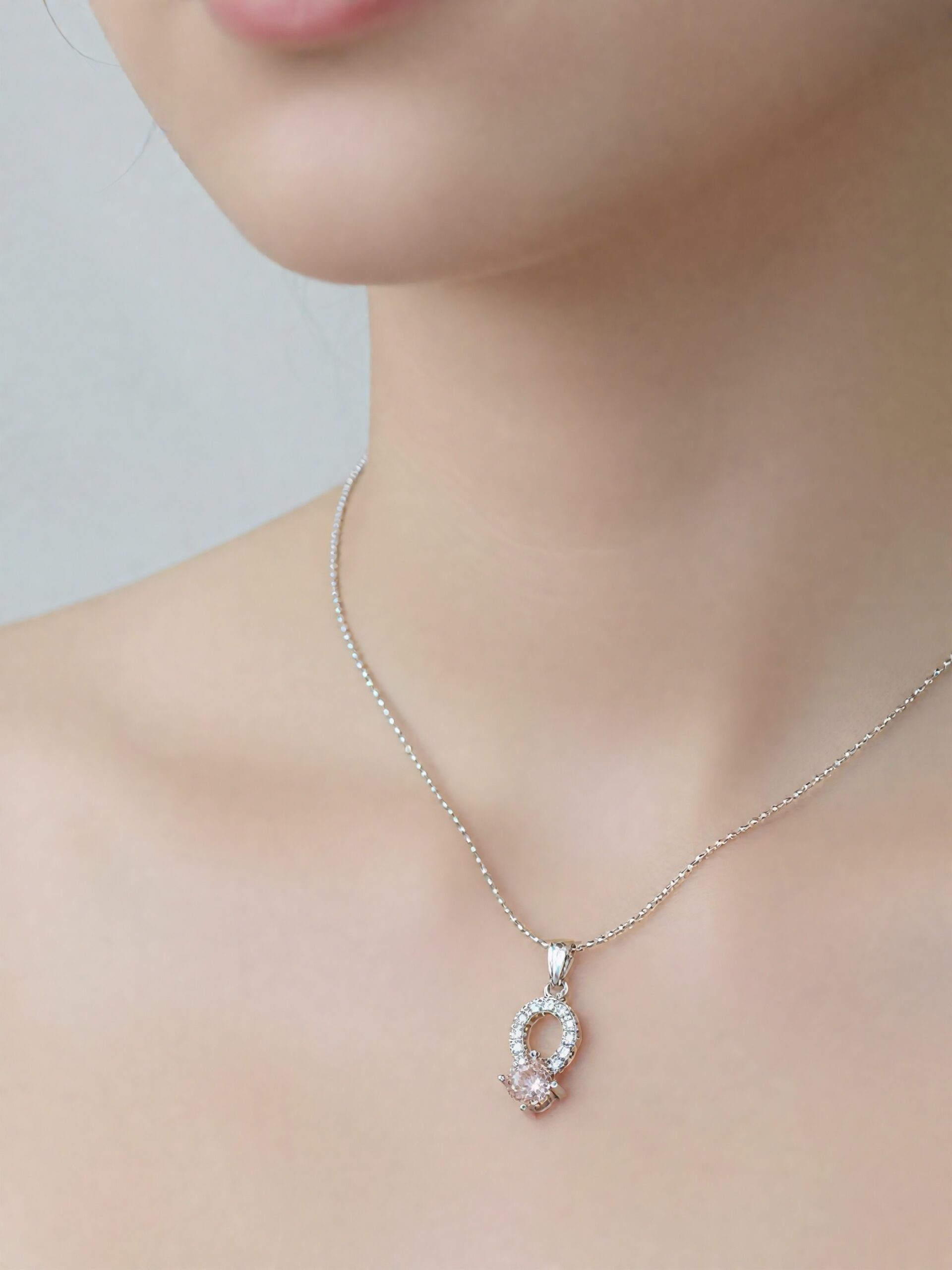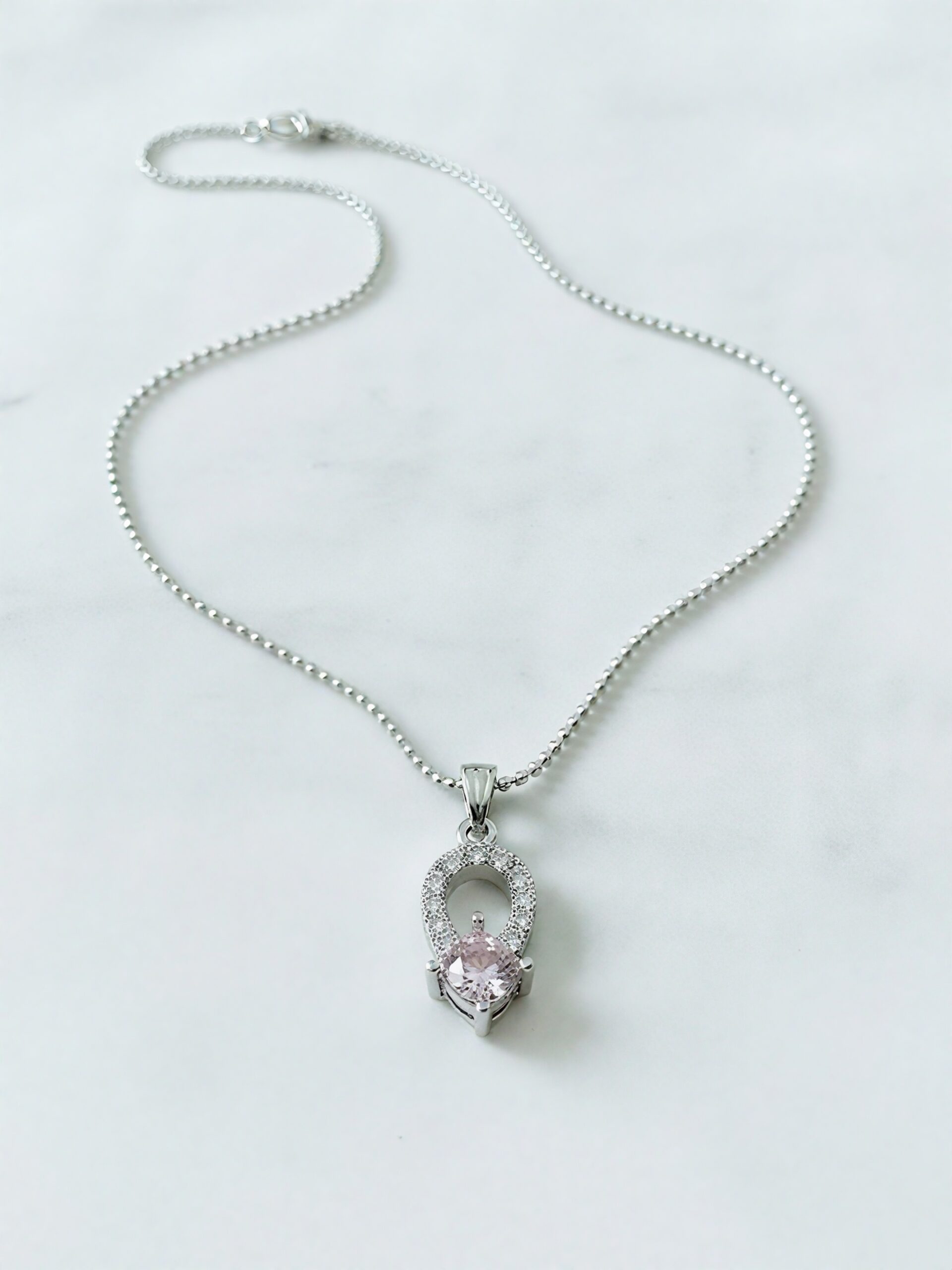 This delicate pendant necklace features a sparkling round-cut pink gemstone set in a shimmering halo of clear stones, all suspended from a fine silver chain. The graceful teardrop-shaped halo setting gives the piece a refined, timeless charm, perfect for adding a subtle touch of luxury to any outfit. Ideal for both everyday wear and special occasions, this necklace is designed to effortlessly elevate your style with its elegant and feminine appeal.