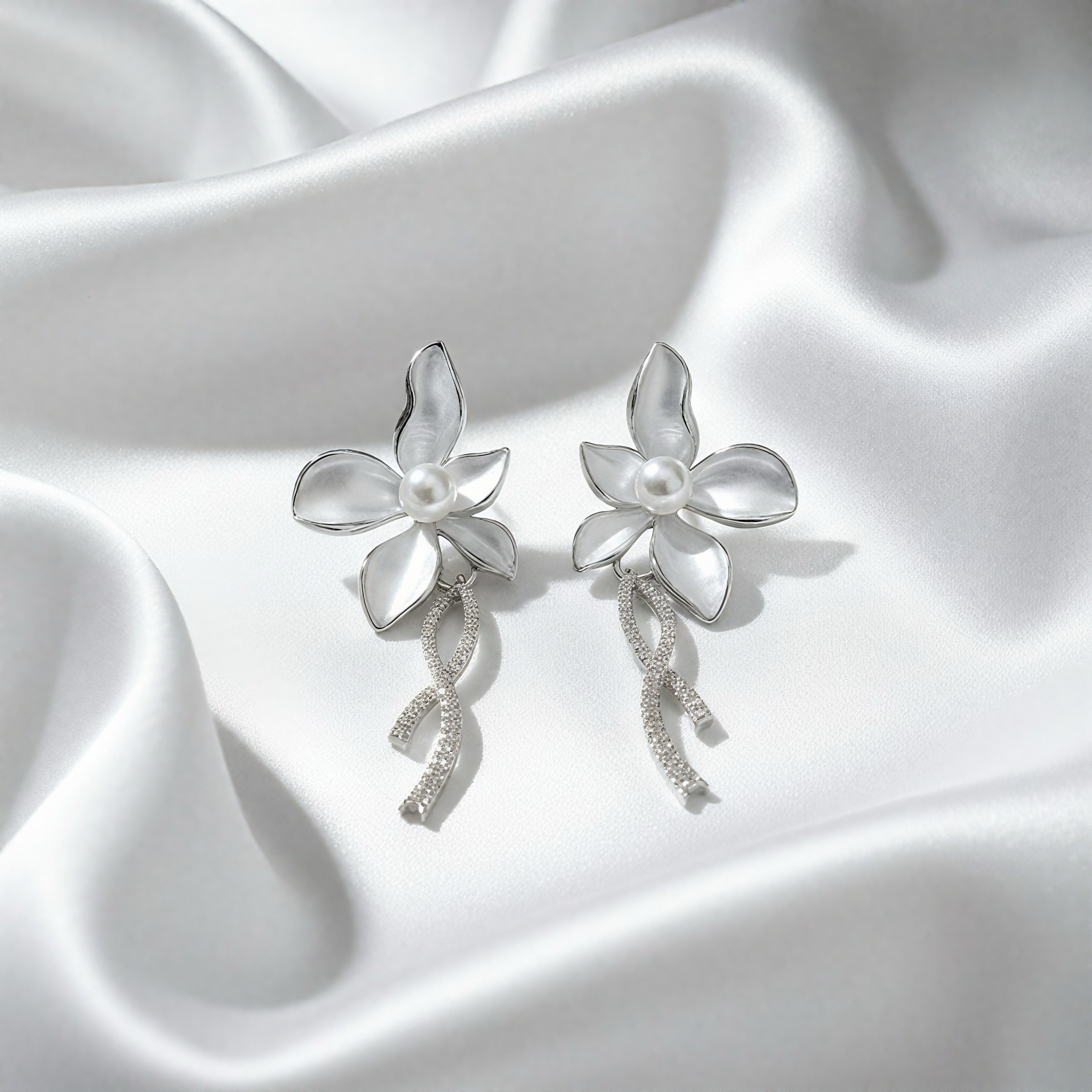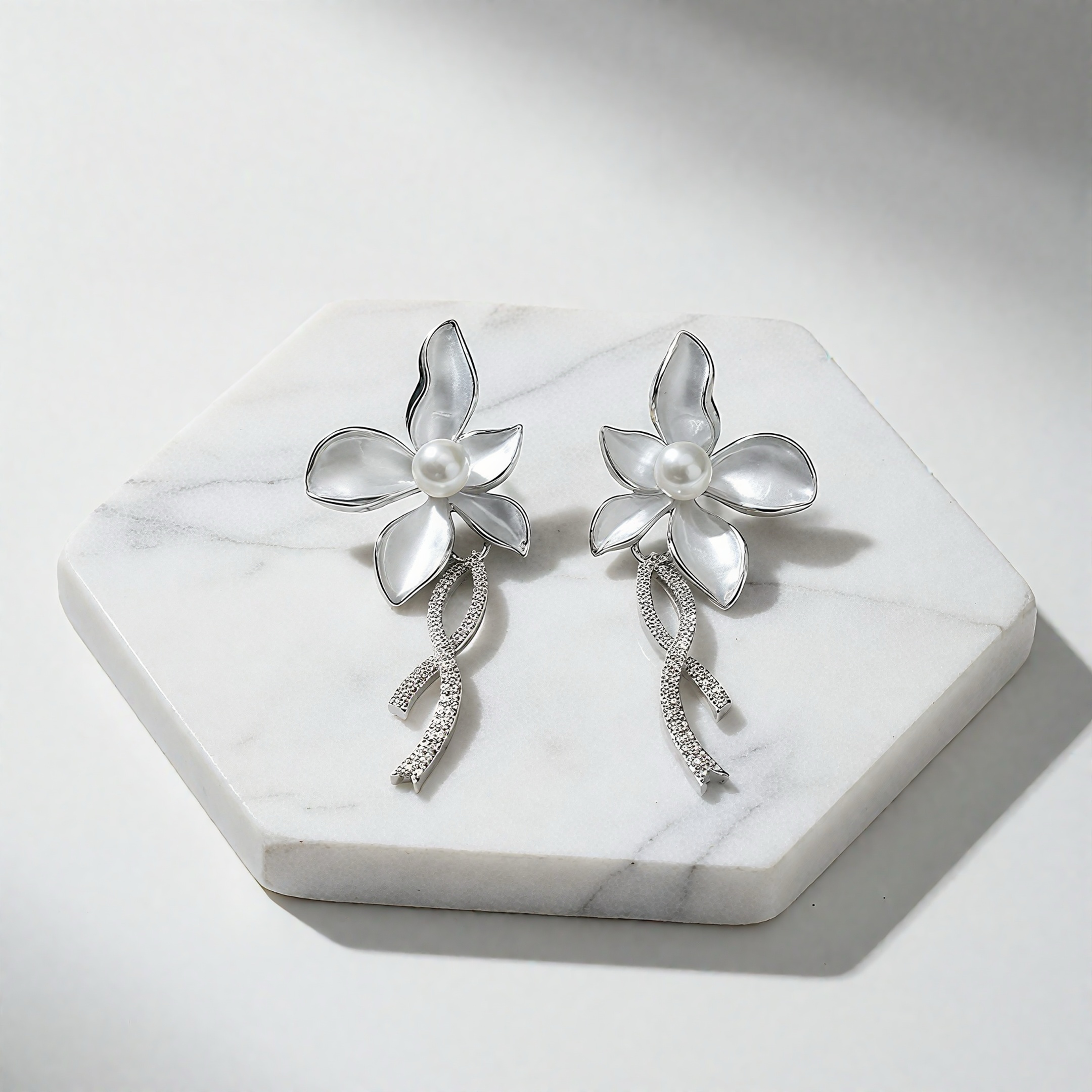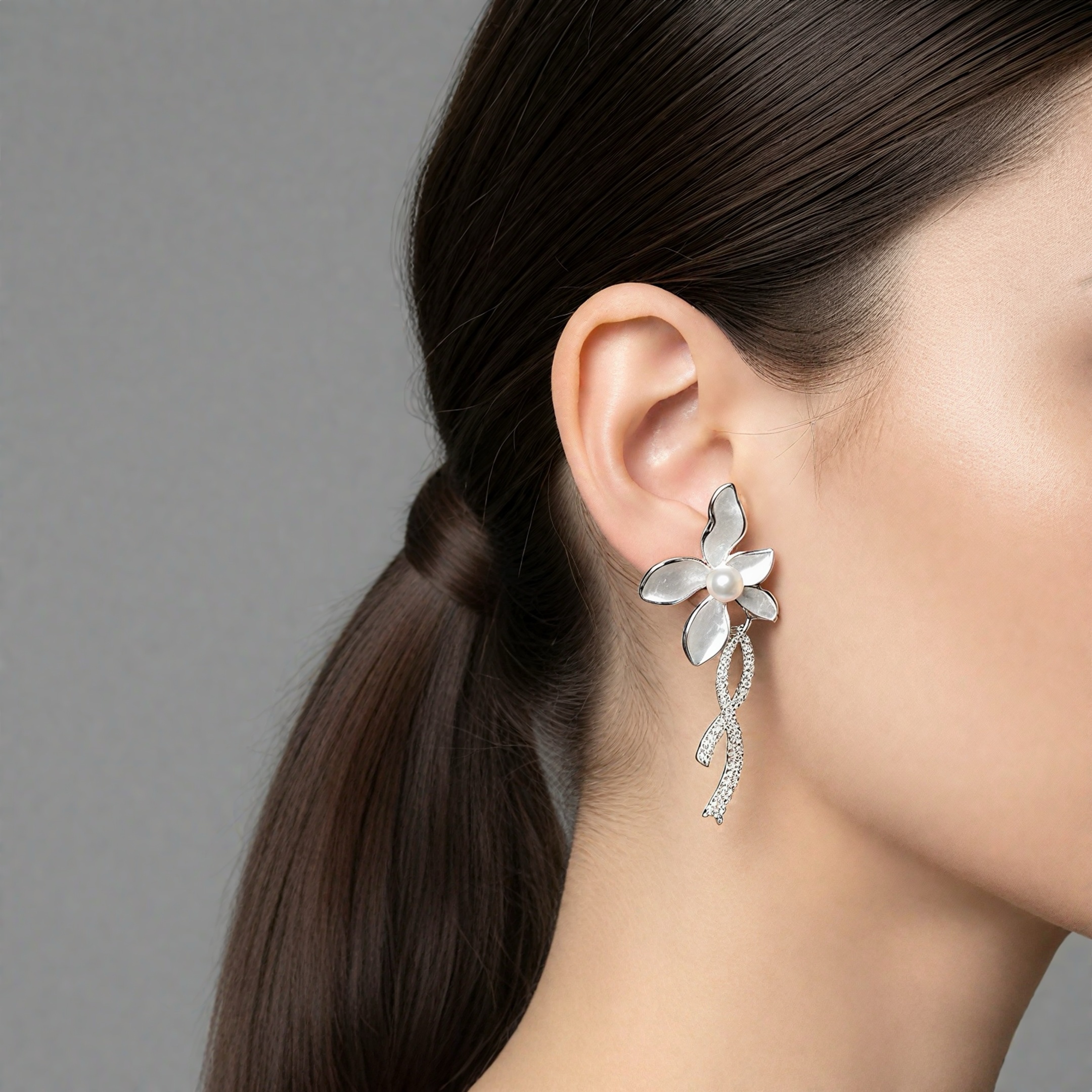 These exquisite orchid-inspired earrings feature delicately sculpted petals with a lustrous pearl at the center, symbolizing grace and sophistication. The sparkling, twisted drop design adds a touch of glamour, making them perfect for weddings, festive occasions, and evening wear. Lightweight and refined, these earrings beautifully blend modern elegance with timeless feminine charm.