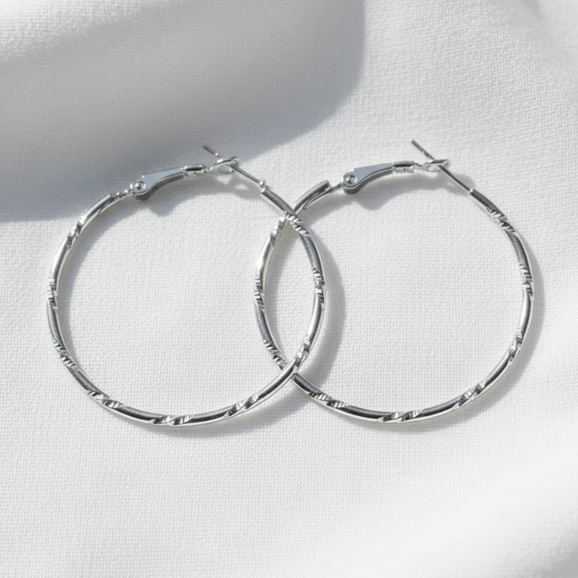 These chic silver hoop earrings feature a sleek, lightweight design with subtle textured detailing that adds a touch of sophistication to any look. Crafted for everyday elegance, they are comfortable to wear and pair beautifully with both casual and formal outfits. A timeless accessory that effortlessly enhances your style.