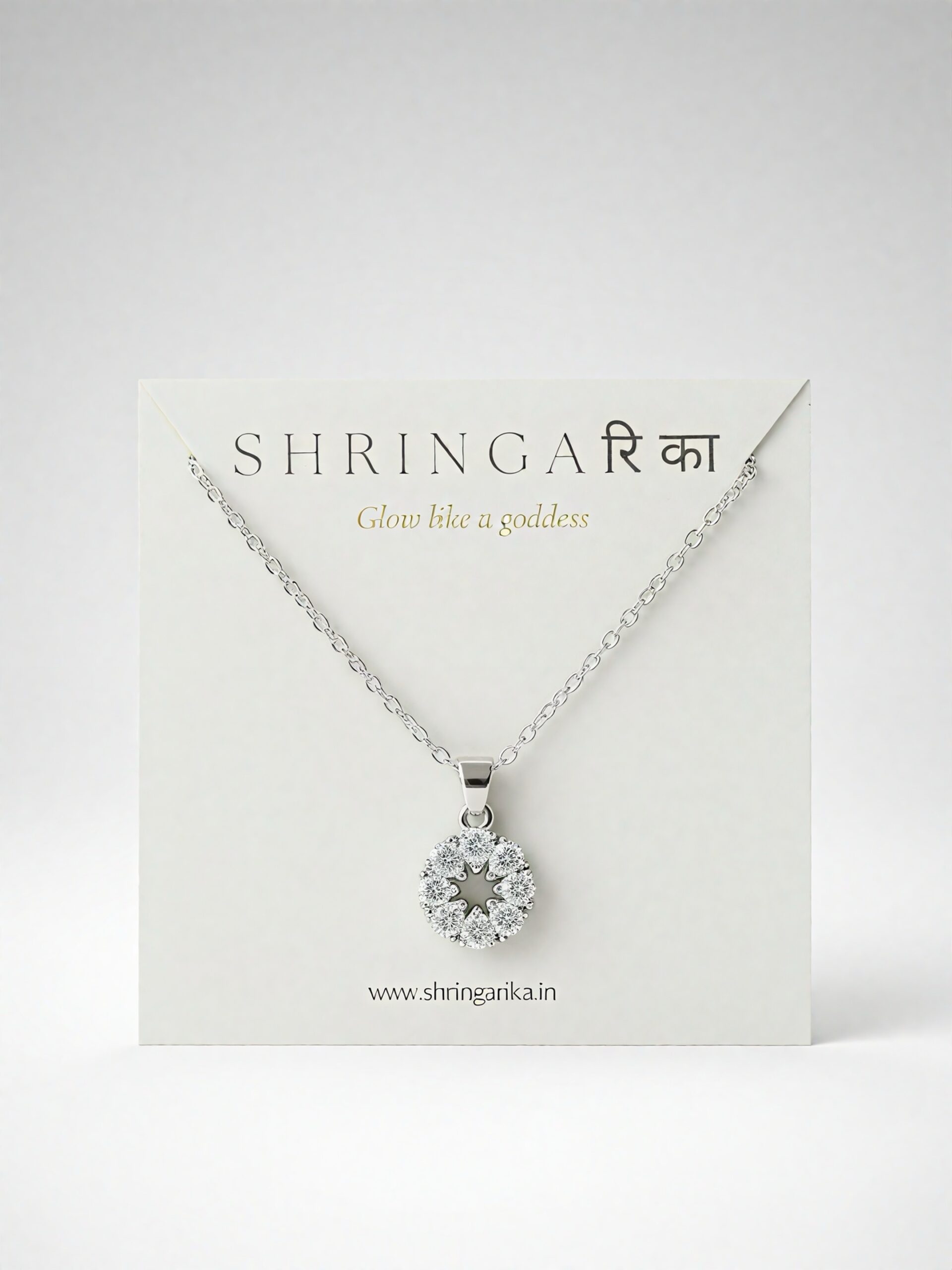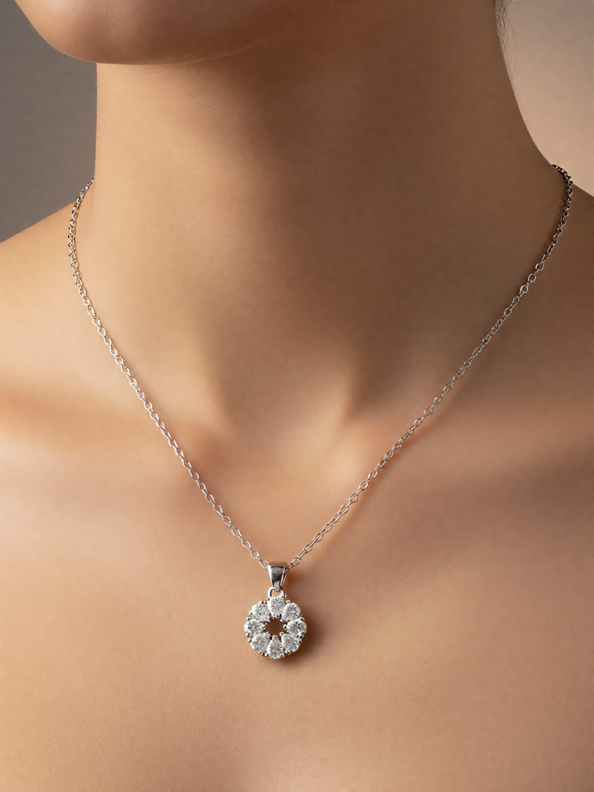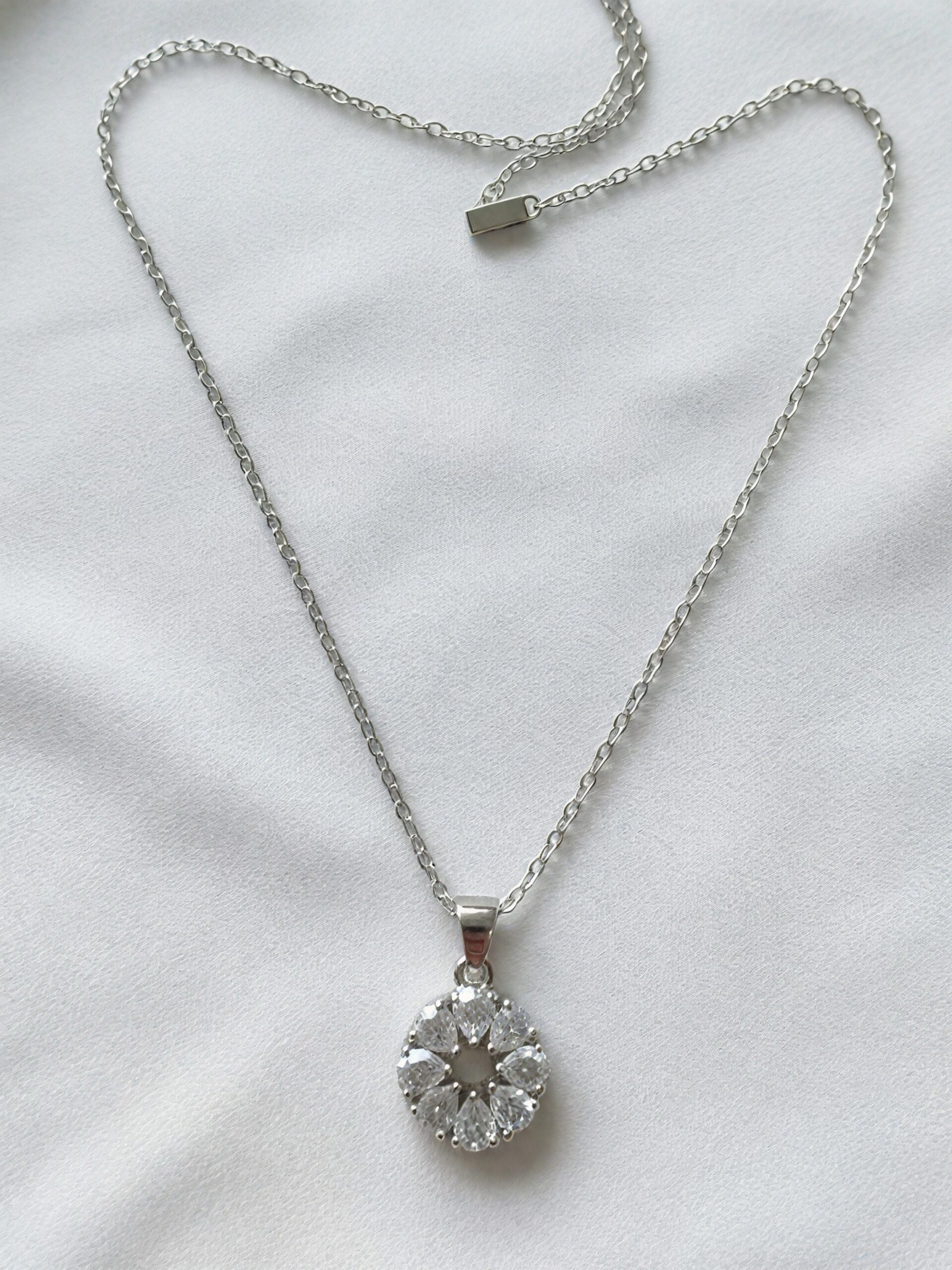 This eye-catching pendant necklace features a circular floral cluster design, with meticulously set marquise-cut stones radiating outwards to form a dazzling bloom. The pendant is suspended from a delicate silver chain that highlights the sparkle and elegance of the centerpiece. Ideal for special occasions and evening wear, this necklace offers a statement look while maintaining a refined, sophisticated appeal.