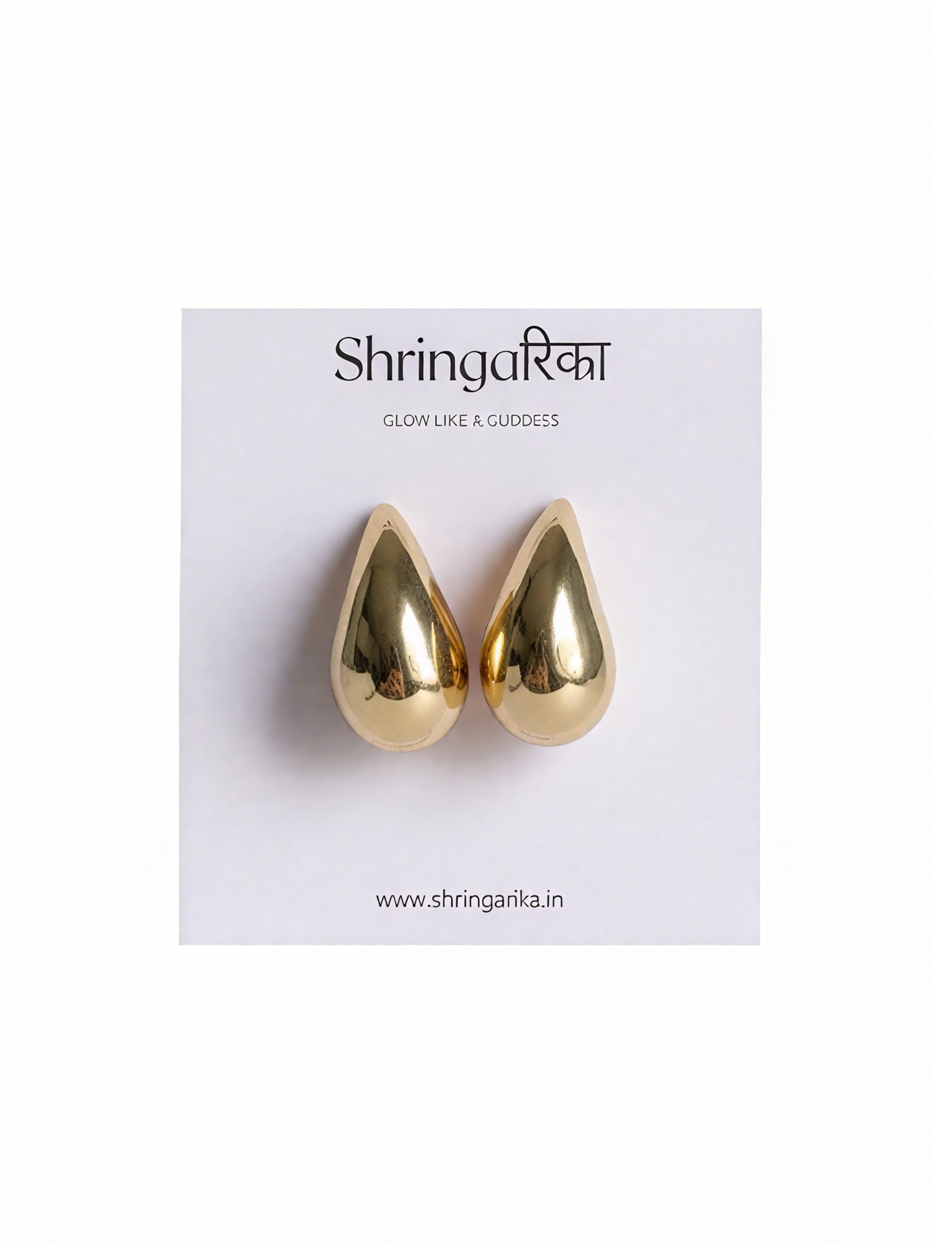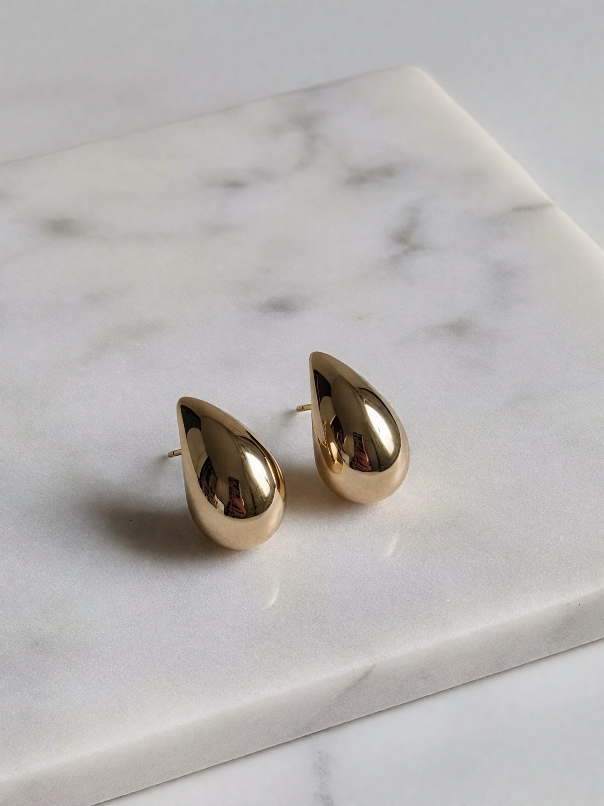 These elegant gold teardrop stud earrings feature a smooth, high-polish finish that reflects light beautifully, offering a luxurious and timeless look. Crafted in a classic teardrop shape, these earrings are versatile enough for both everyday wear and formal occasions. The minimalistic design ensures they pair effortlessly with any outfit, adding a touch of sophistication and style. Perfect for those who appreciate understated elegance and quality craftsmanship.