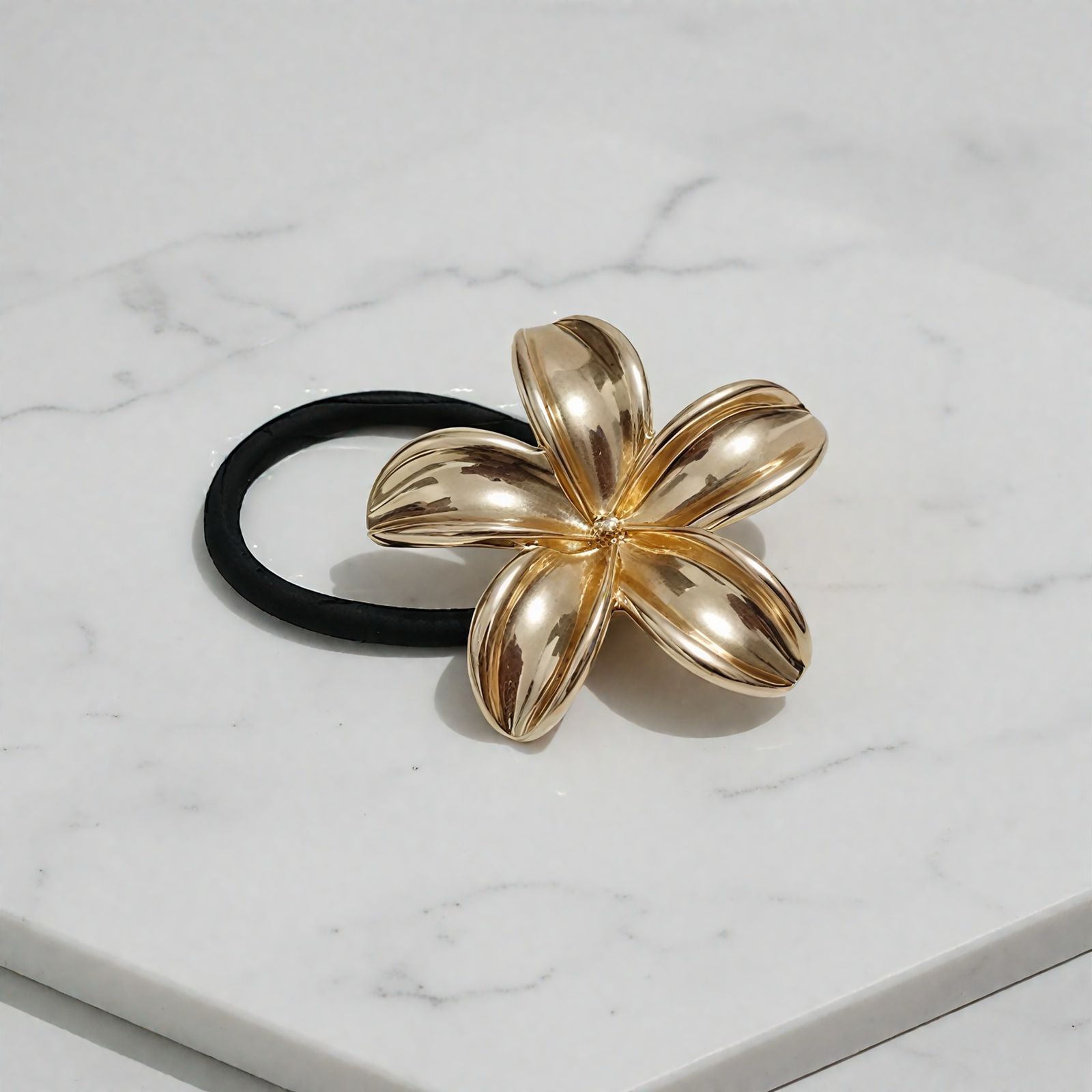 Add a touch of elegance to your everyday look with the Golden Bloom Floral Hair Tie. Featuring a polished gold-tone flower with sculpted petals, this accessory blends timeless charm with modern minimalism. The smooth, high-shine finish catches the light beautifully, while the durable elastic band ensures a comfortable and secure hold. Perfect for elevating casual hairstyles or complementing formal outfits, this hair tie is a chic statement piece you’ll reach for again and again.