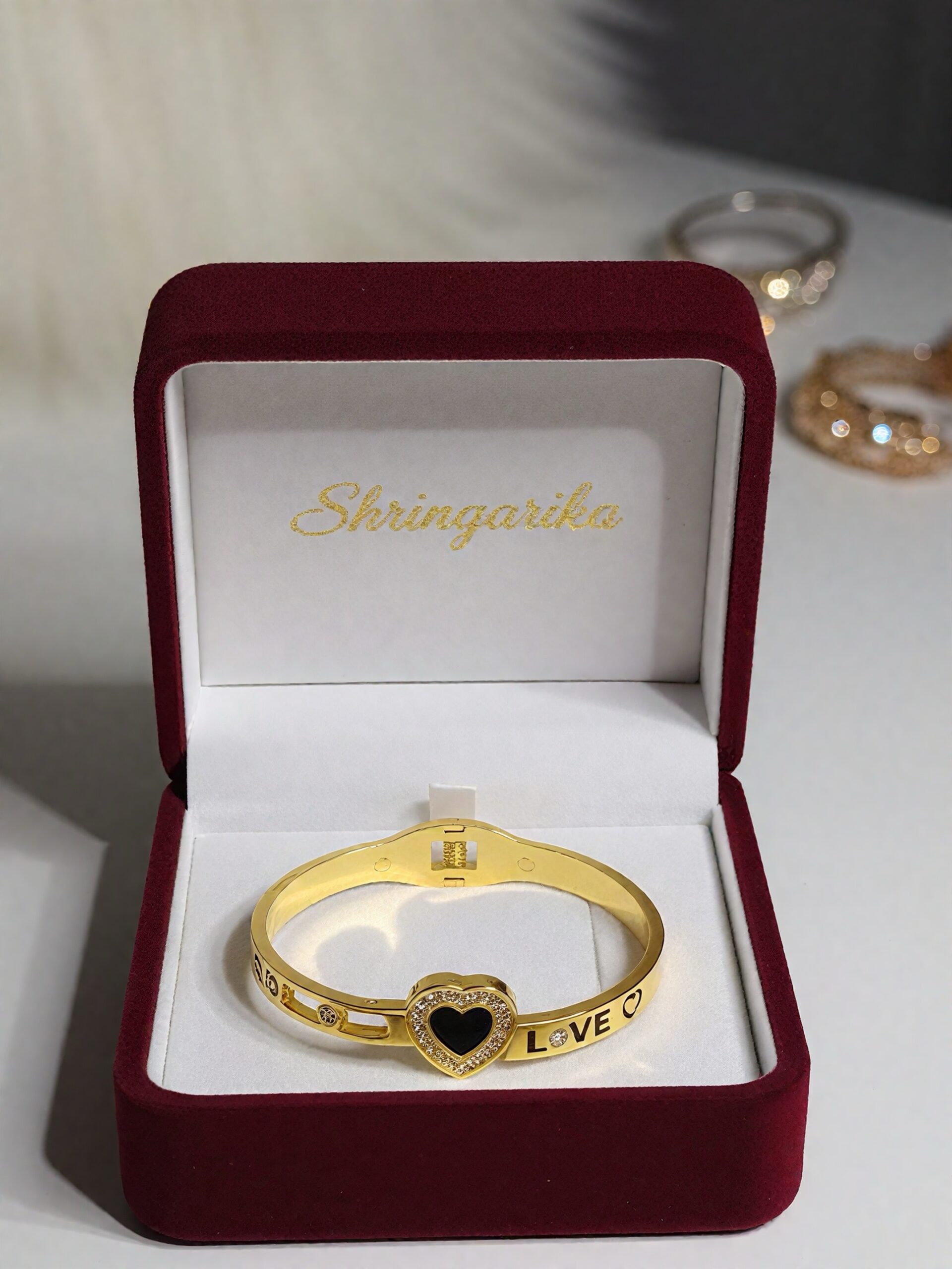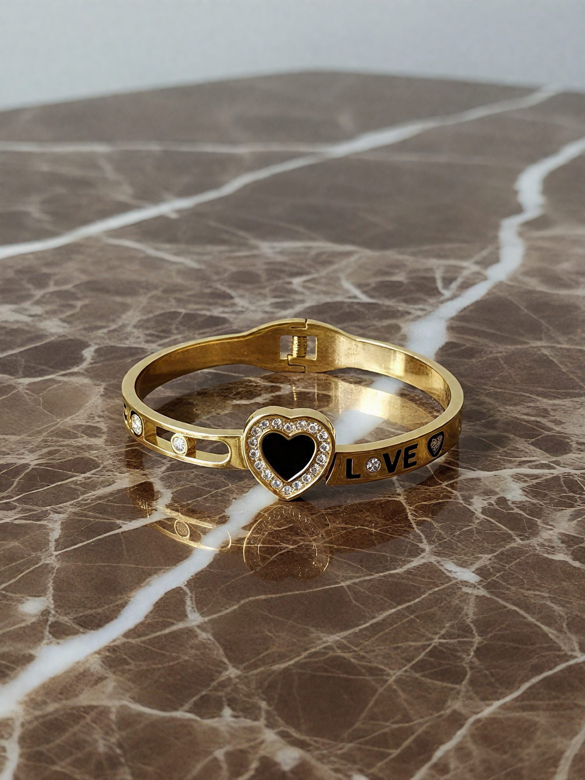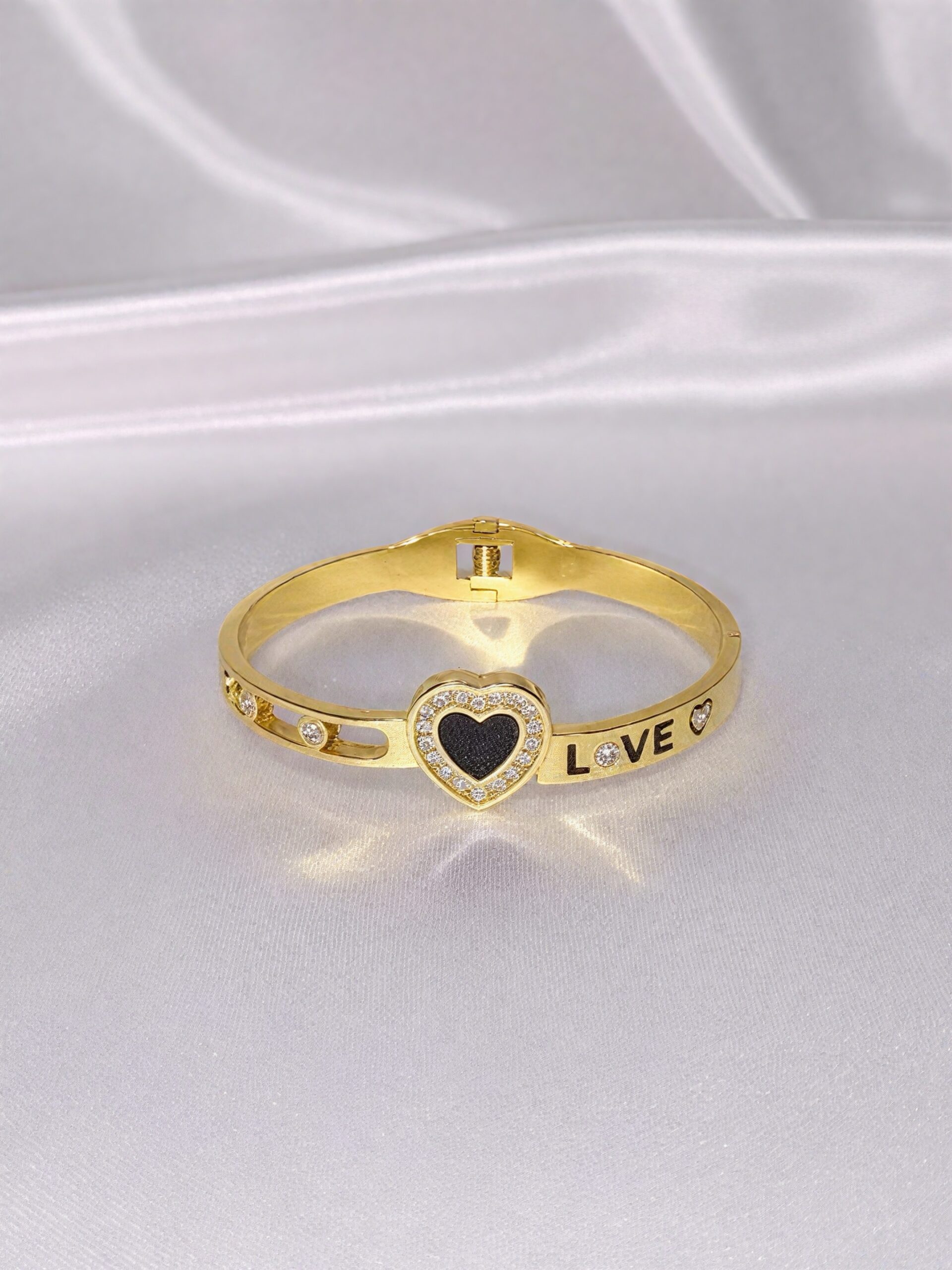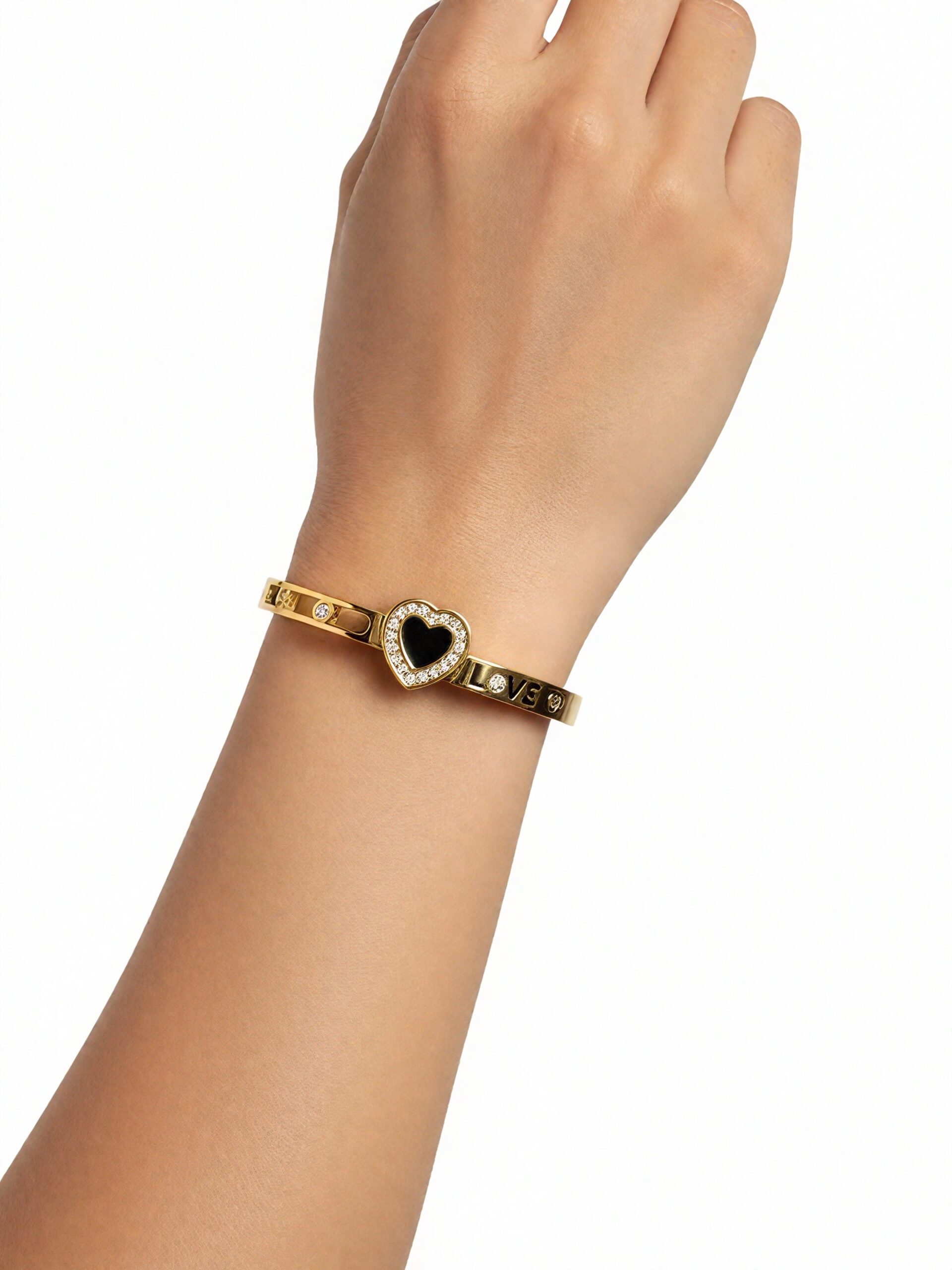 A stylish gold-tone bracelet featuring a black enamel heart centerpiece surrounded by sparkling stones, along with “LOVE” detailing on the band. Perfect for gifting or adding a touch of elegance to everyday outfits.