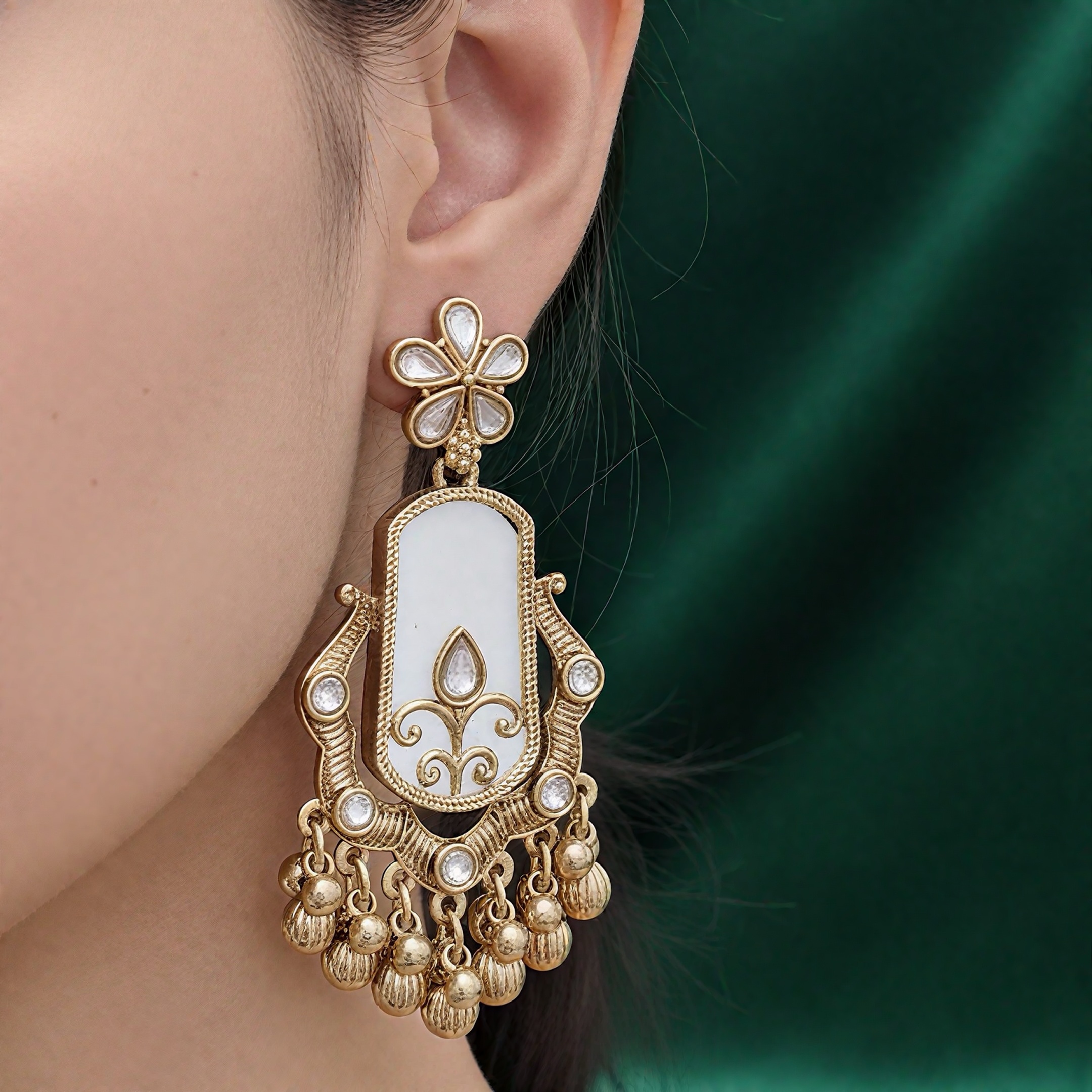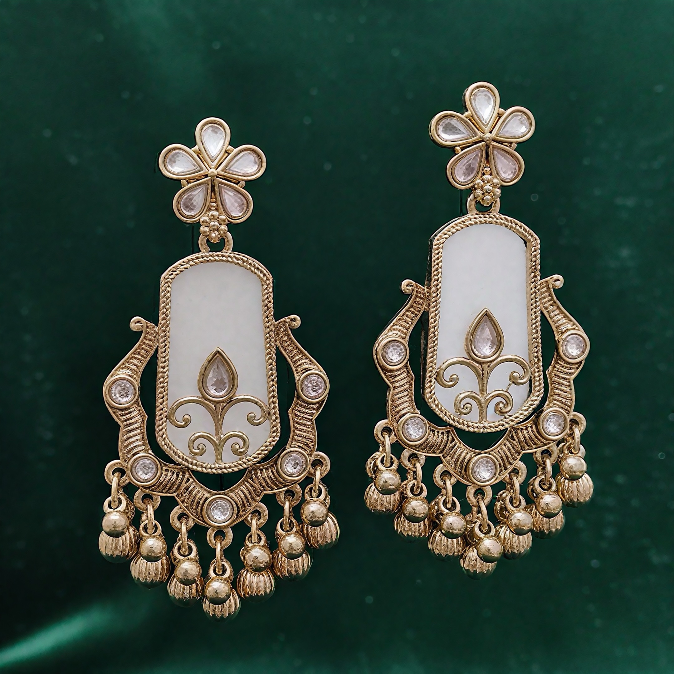 Surrounding the lower frame are finely set crystal stones that add brilliance, while the dangling ghungroo-style gold beads at the bottom create a soft, rhythmic movement, making these earrings eye-catching with every turn.