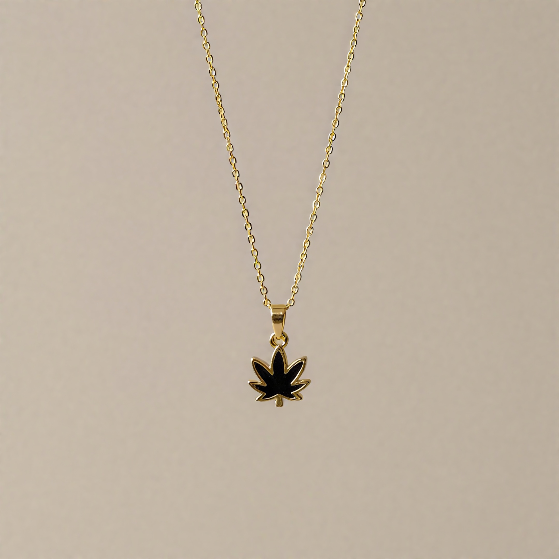 The Midnight Leaf Charm Necklace features a sleek black leaf-shaped pendant outlined in a glossy gold-tone finish, hanging from a delicate, minimal chain. Its clean silhouette and bold contrast make it a stylish piece for everyday wear with a subtle edgy vibe.