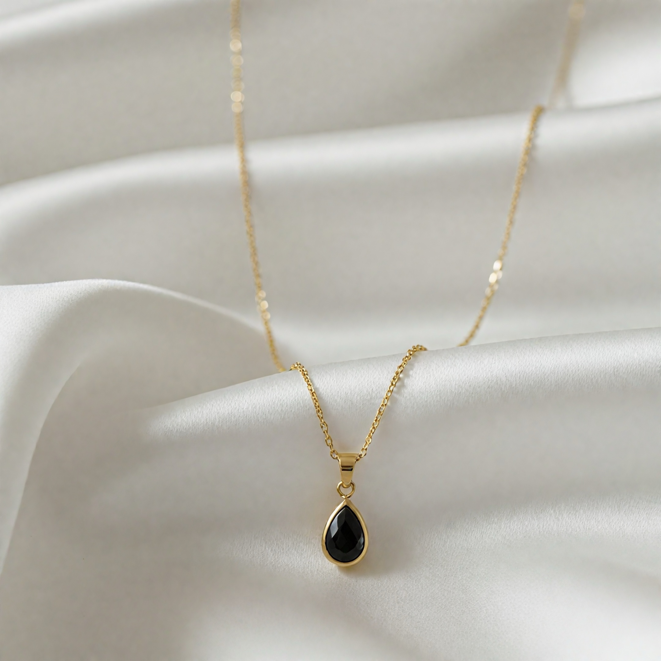 The Noir Teardrop Solitaire Necklace features a sleek teardrop-shaped black stone framed in a delicate gold-toned bezel, suspended from a fine, minimalist chain. This refined piece adds a subtle pop of contrast, making it perfect for both everyday wear and evening occasions.