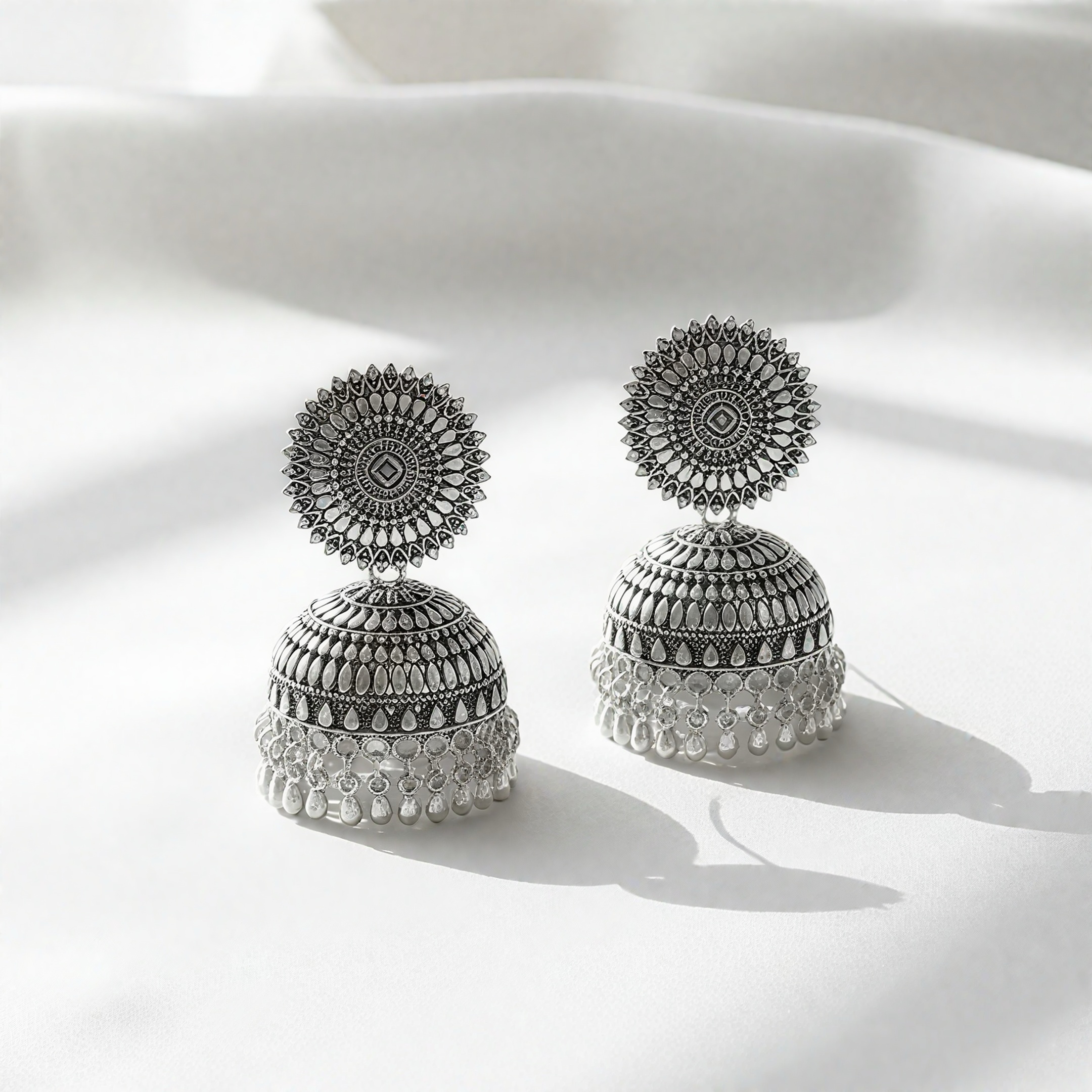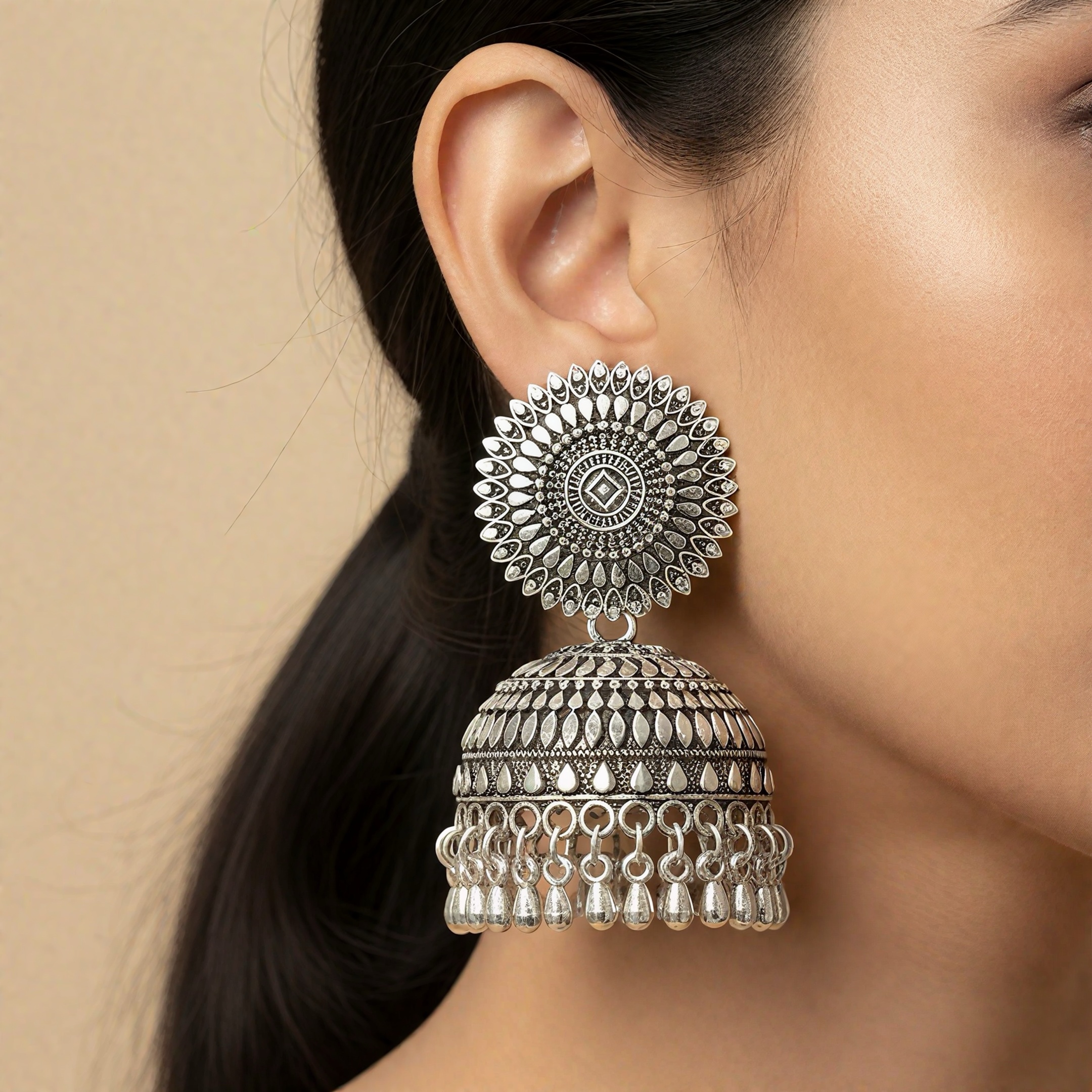 Elevate your ethnic look with these exquisitely handcrafted oxidised silver jhumka earrings, inspired by timeless Indian artistry. The earrings feature a beautifully detailed mandala-style stud, symbolising elegance and balance, adorned with intricate floral and geometric motifs.