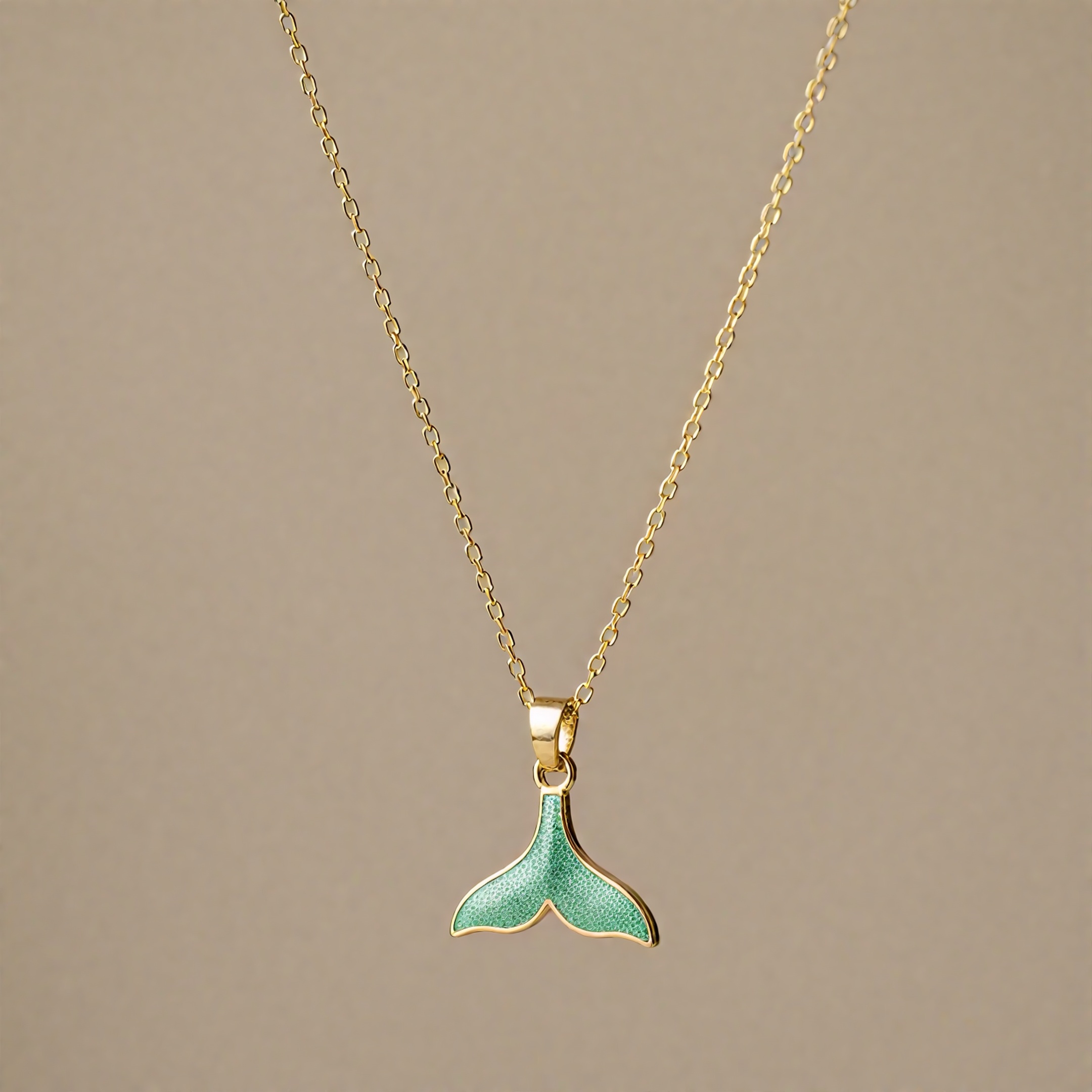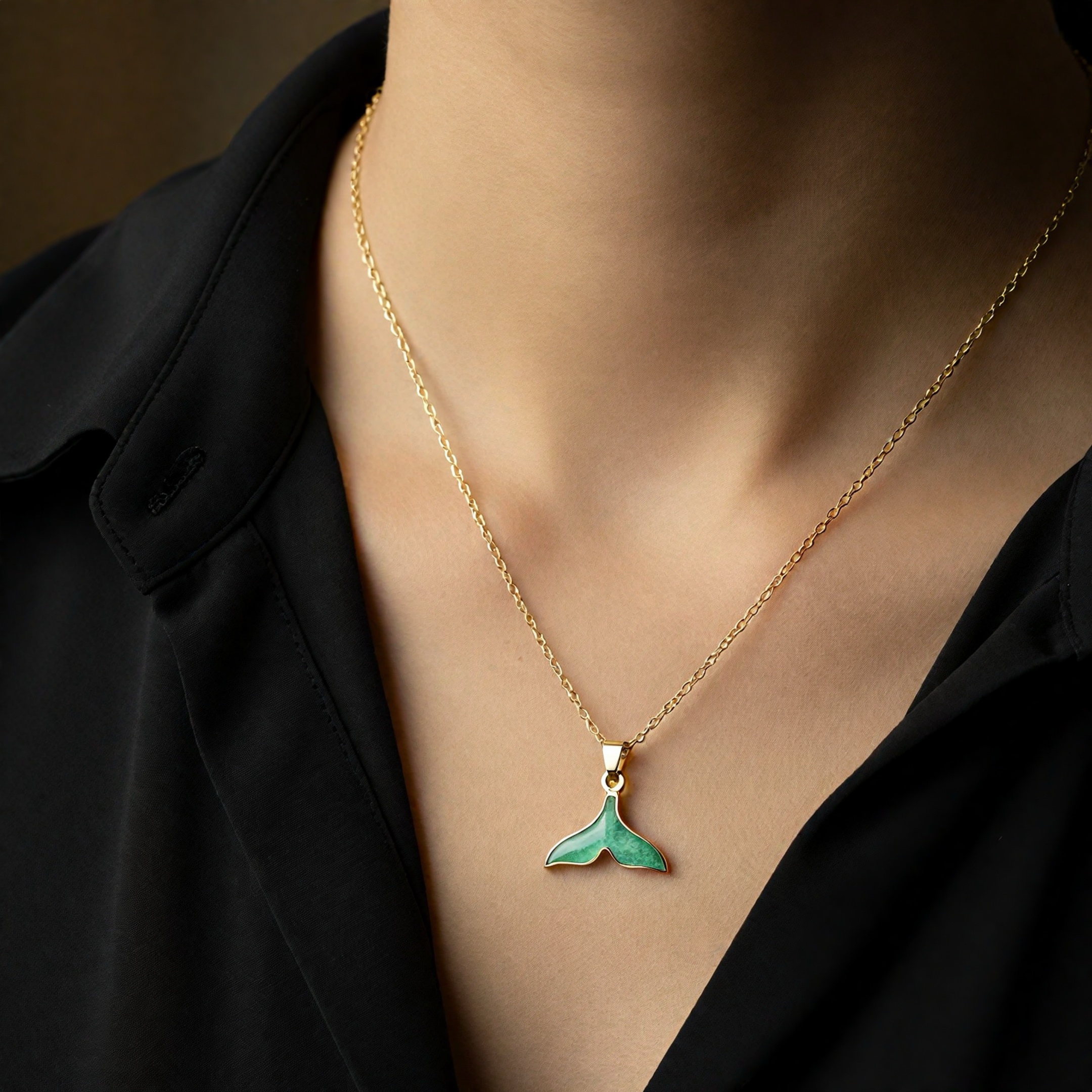 Bring a touch of ocean-inspired elegance to your jewelry collection with this beautifully crafted Whale Tail Pendant Necklace. Designed with a minimal yet graceful aesthetic, the pendant features a stylized whale tail motif finished in a soothing sea-green enamel, outlined with a polished gold-tone border for a refined look.