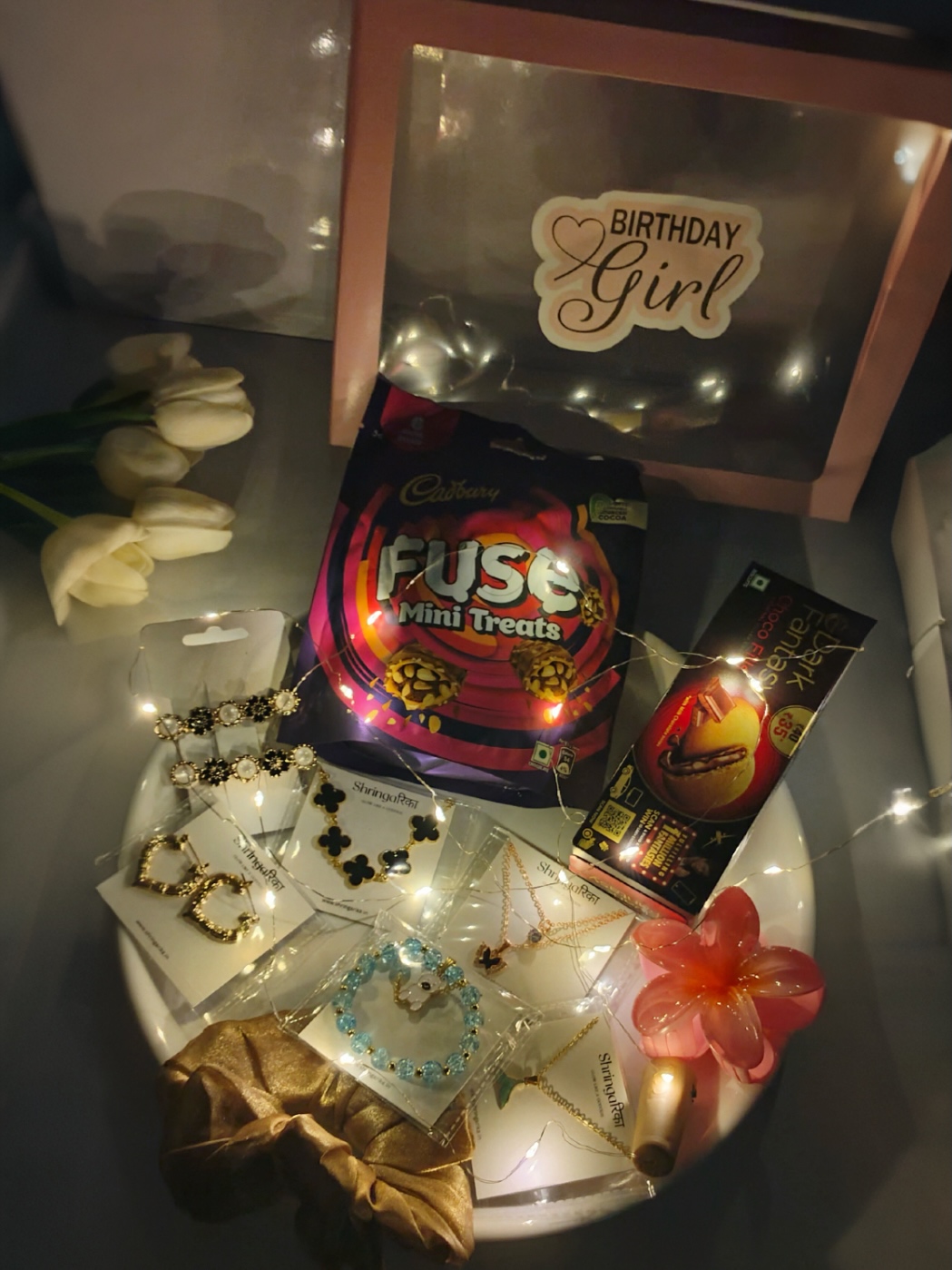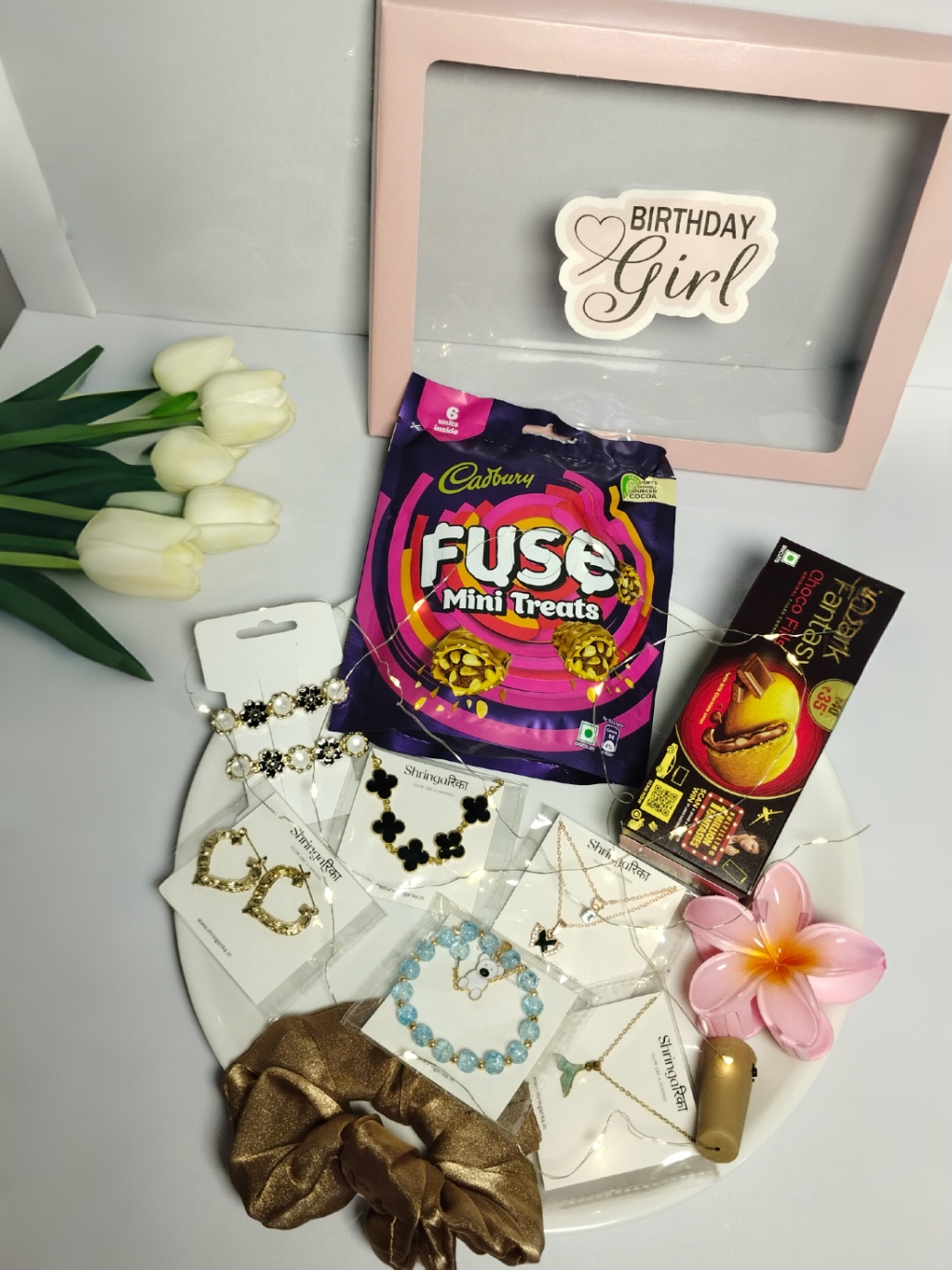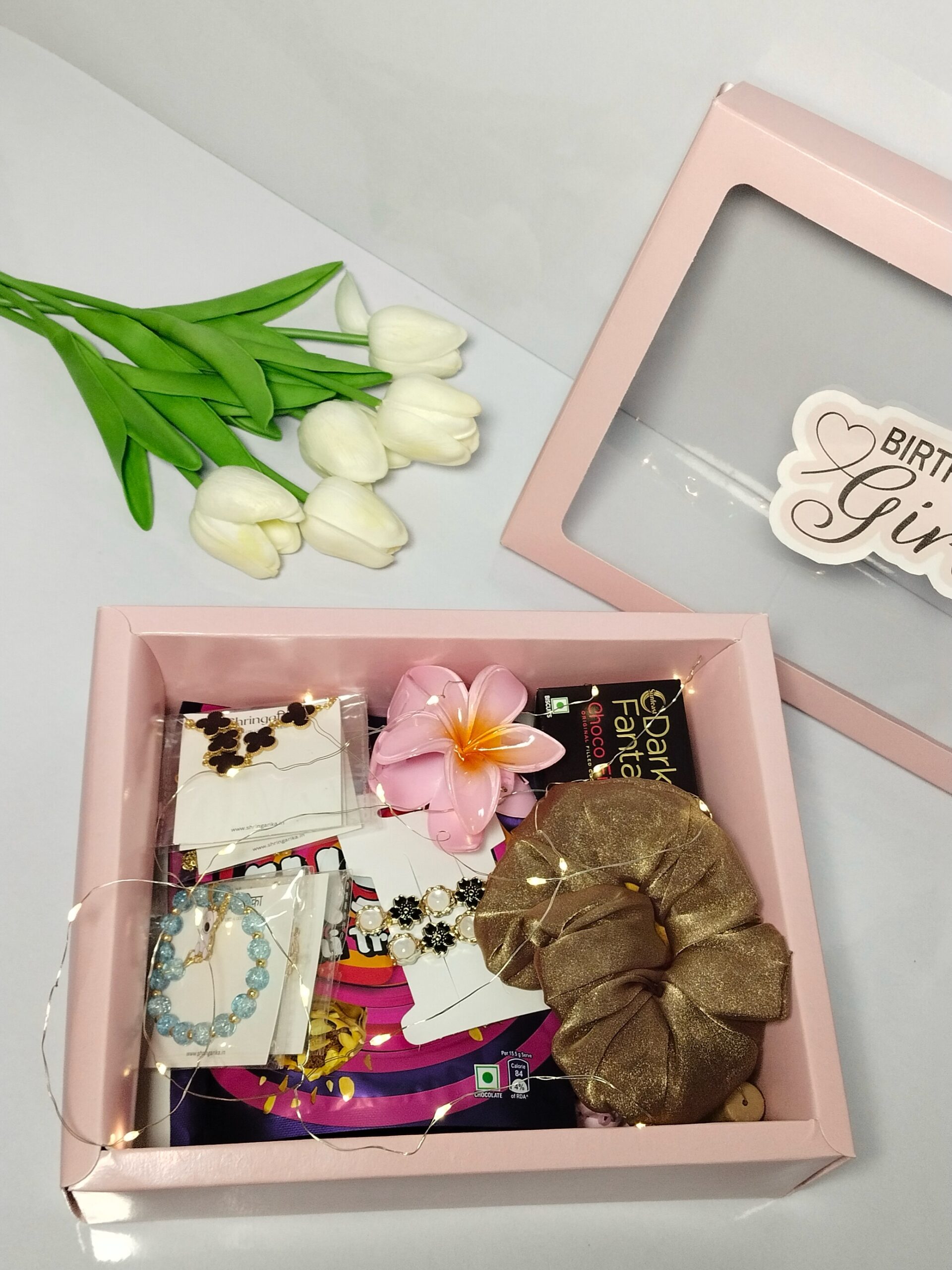 Make her birthday extra special with this beautifully curated Birthday Bliss Gift Hamper. Designed with love and elegance, this hamper combines stylish jewelry, sweet treats, and cute accessories to create a perfect surprise for the birthday girl. The aesthetic pink gift box with decorative lights makes it a memorable and Instagram-worthy gift.