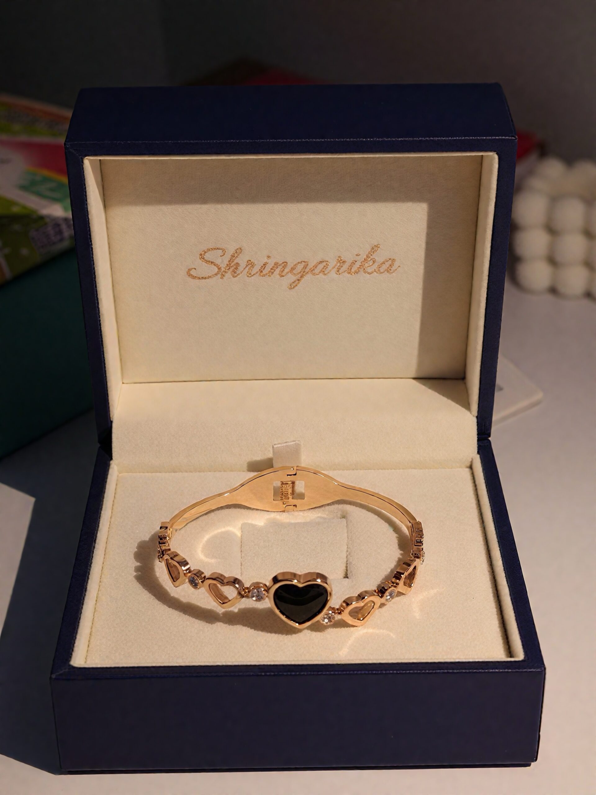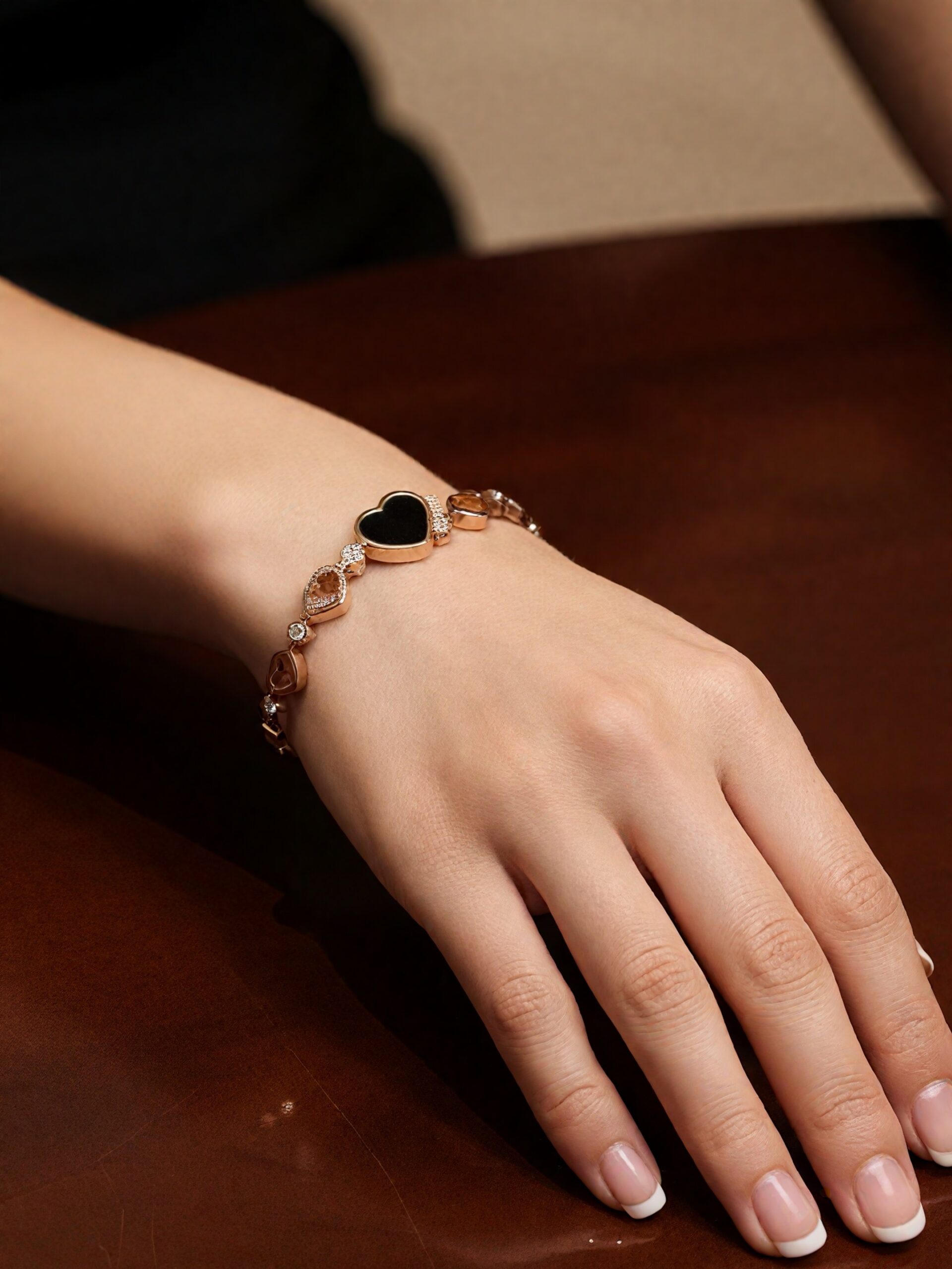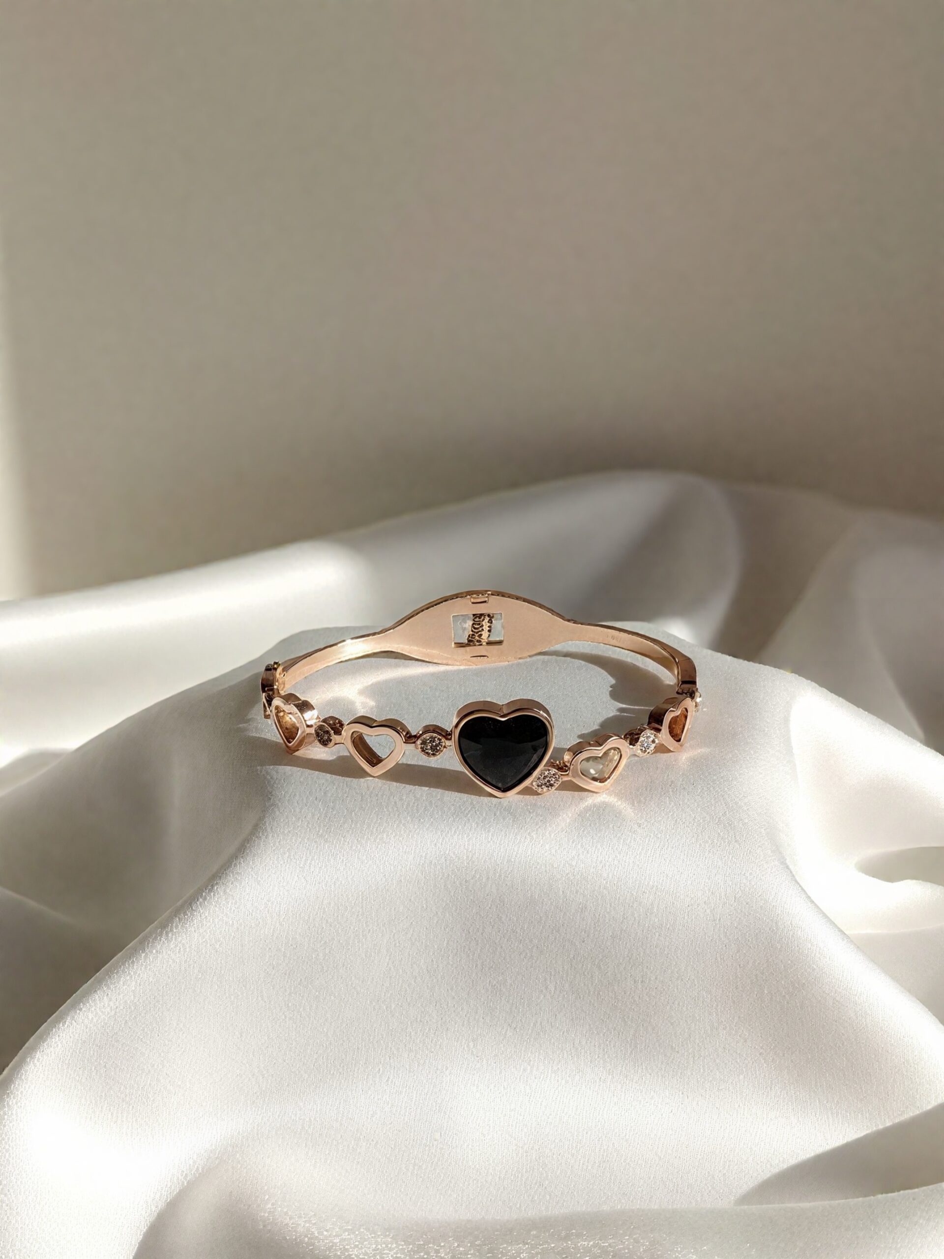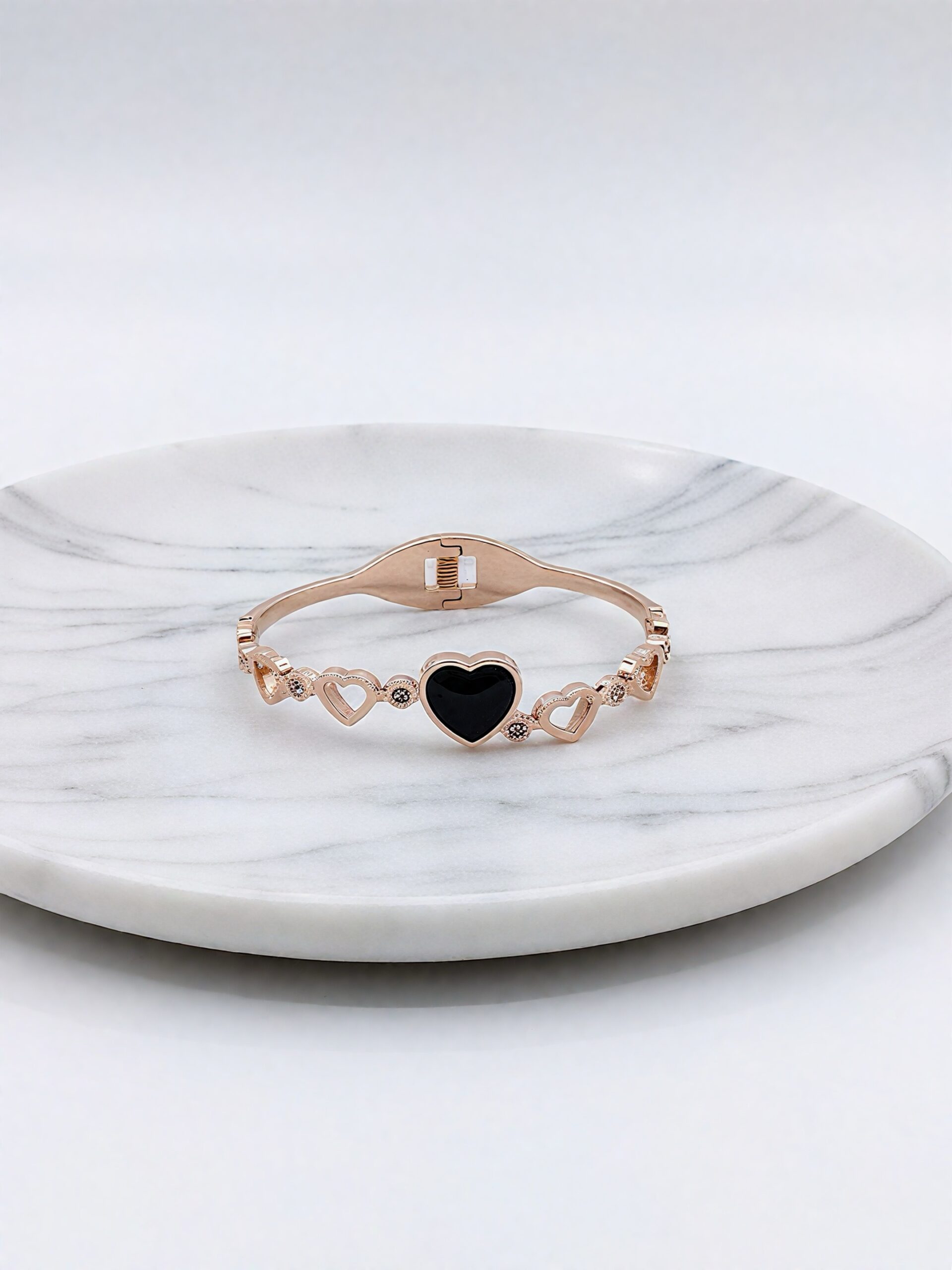 A delicate rose-gold bracelet featuring an elegant central black heart charm, accented with open-heart links and small sparkling stones. Stylish, lightweight, and perfect for gifting or everyday wear.