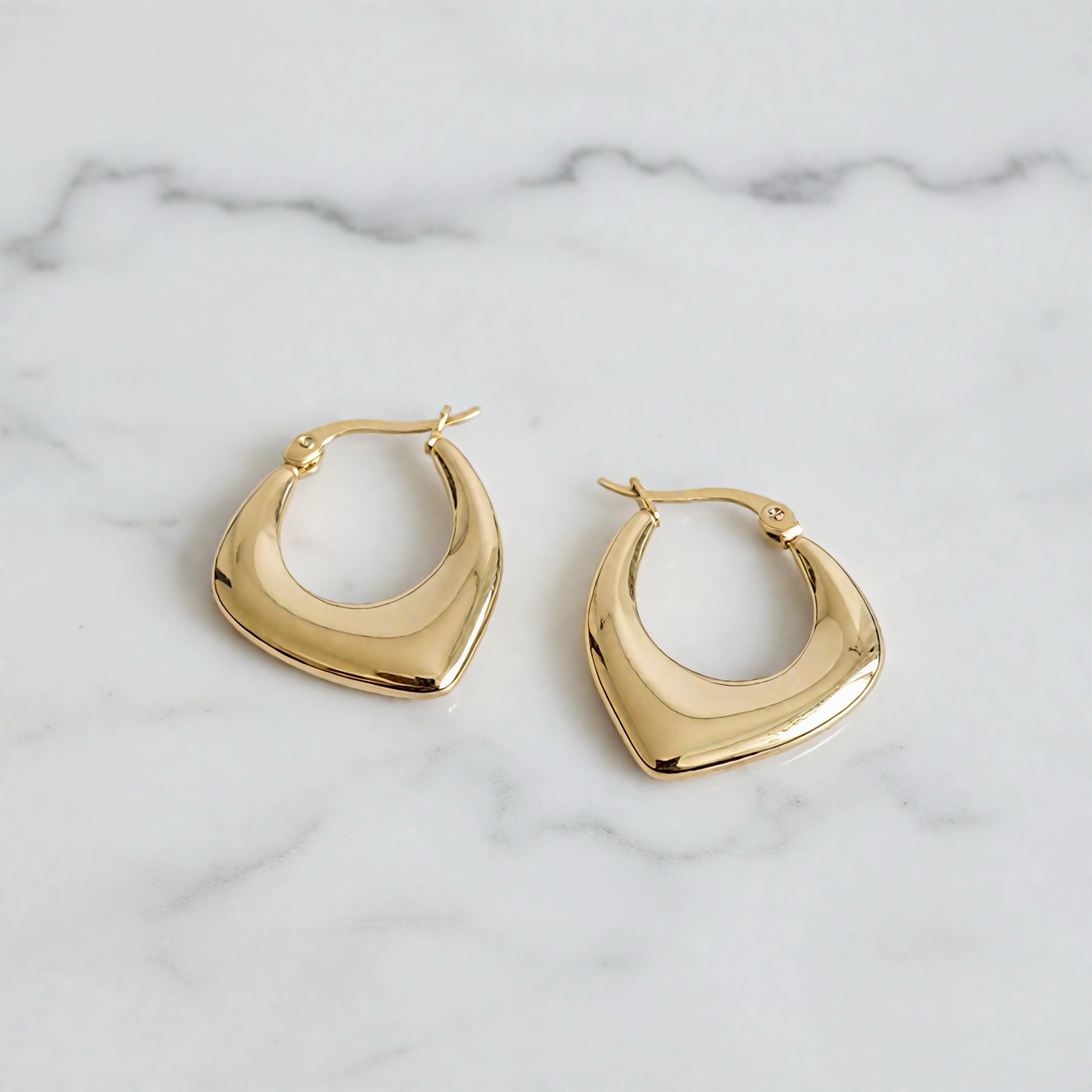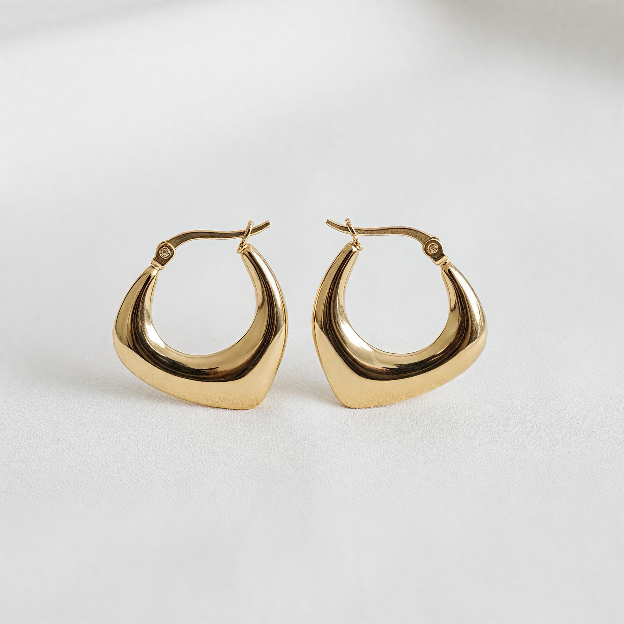 These bold and contemporary hoop earrings feature a sleek, sculpted design crafted in a glossy gold-tone finish. The unique triangular-curved shape gives them a modern, architectural look while maintaining the elegance of classic hoops. With their smooth, mirror-like polish and secure latch-back closure, these earrings offer both style and comfort for everyday wear or special occasions. Perfect for elevating casual outfits, party looks, or office ensembles, they add a sophisticated, fashion-forward touch to any wardrobe.