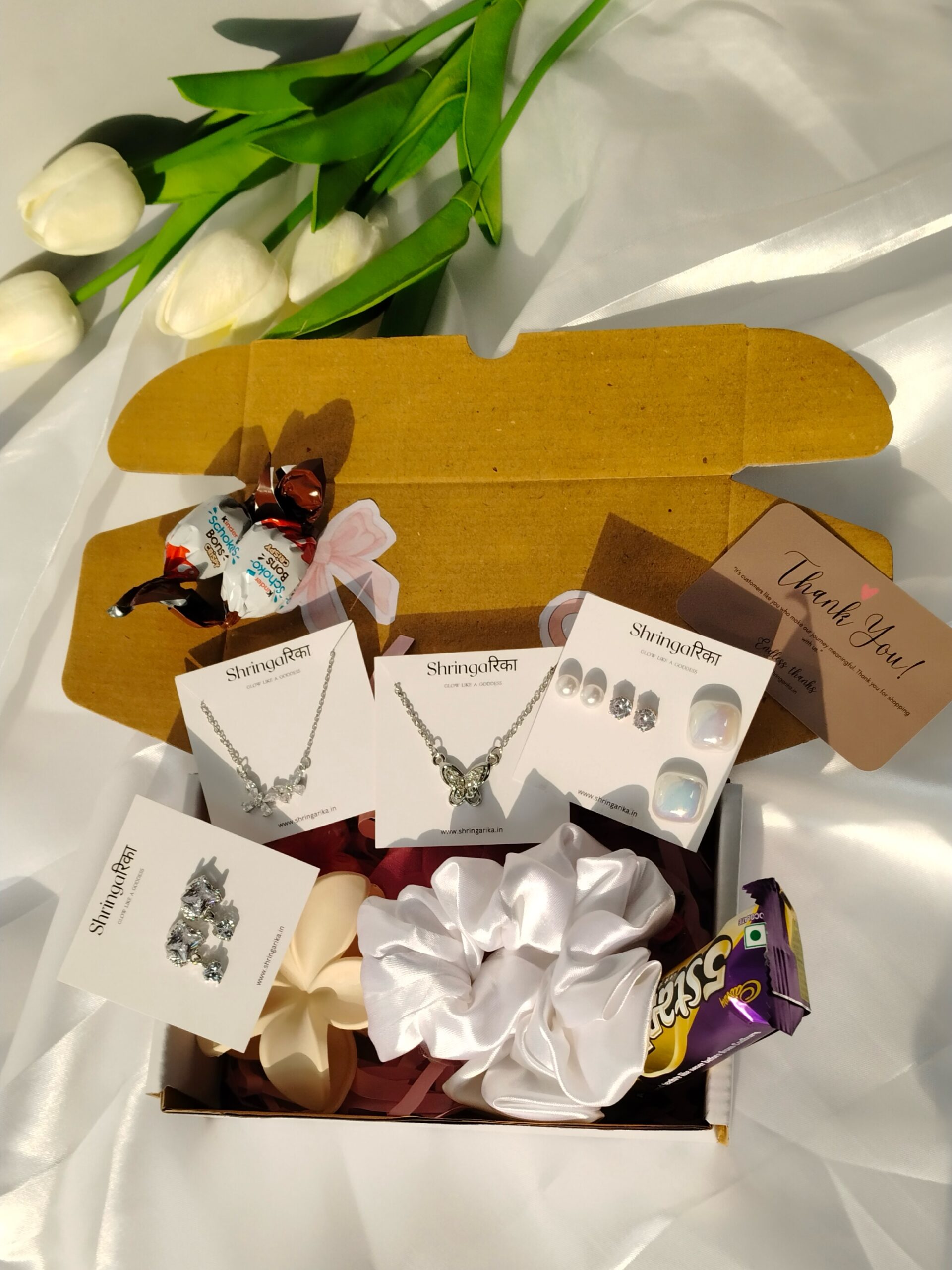 A beautifully curated Shringarika gift box featuring elegant jewelry pieces (earrings and a pendant set), floral-themed accessories, a soft pink scarf, and chocolates. Perfect for gifting, it blends style, sweetness, and a touch of luxury—designed to make anyone “glow like a goddess.”