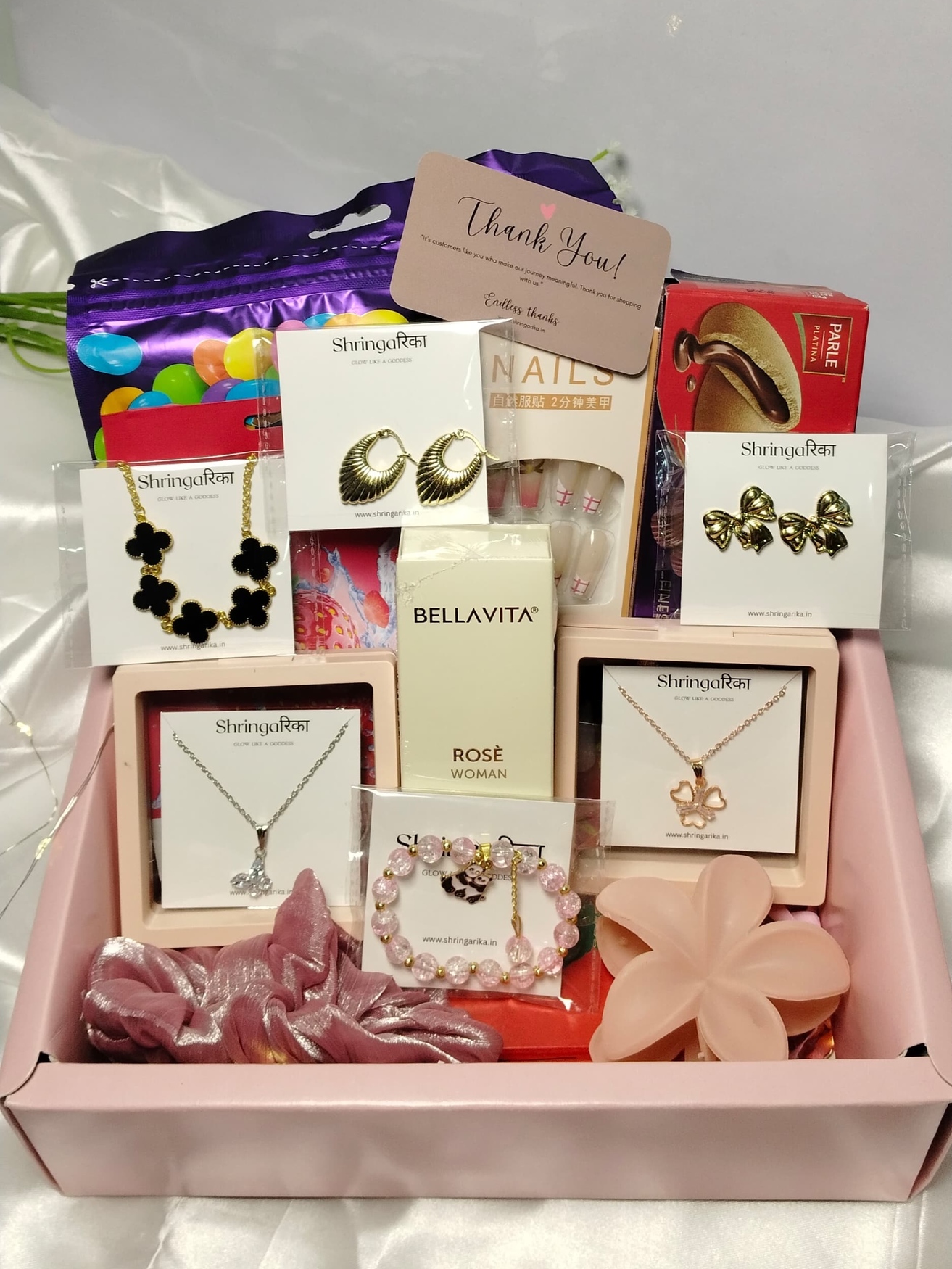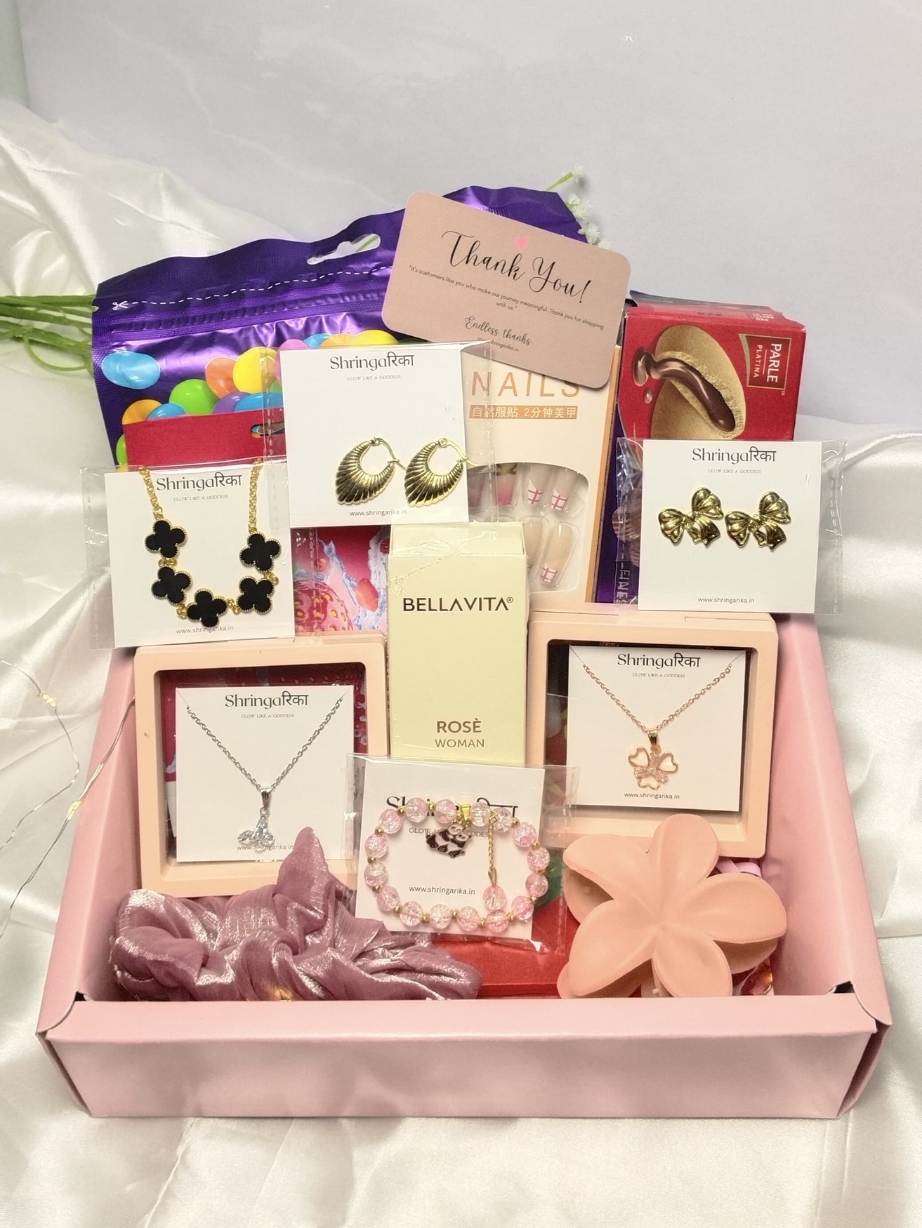 This beautifully curated gift hamper is a luxurious blend of fashion accessories, beauty essentials, and delightful treats — thoughtfully arranged in an elegant pink gift box. The hamper features a selection of premium Shringarika jewelry pieces, including stylish earrings, pendant necklaces, charm bracelets, and trendy scrunchies, perfect for adding a touch of elegance to any look.