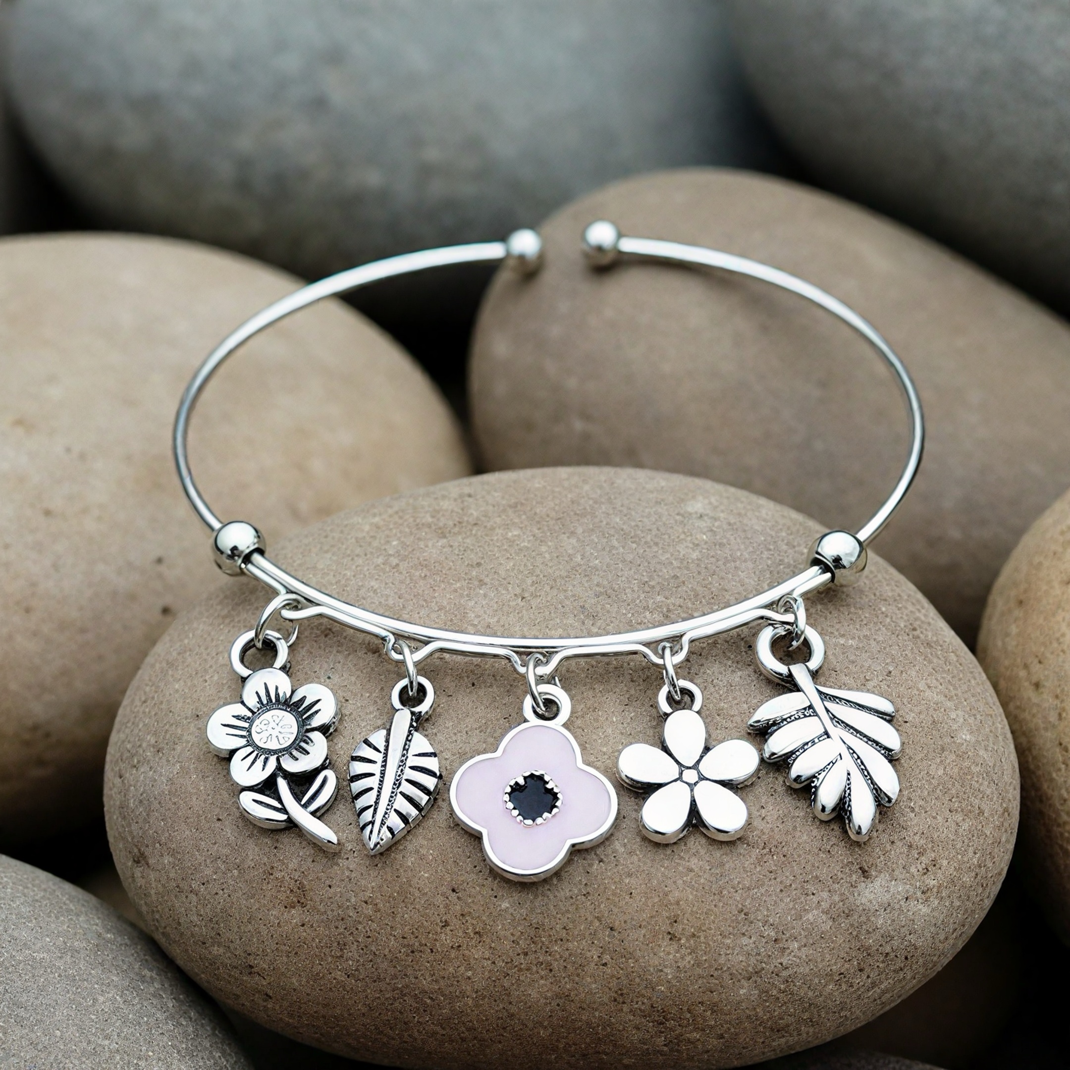 This Silver Charm Floral Adjustable Bangle Bracelet is a stylish and elegant accessory designed for women who love minimal yet expressive jewelry. The bracelet features a sleek silver-tone open bangle adorned with multiple delicate charms, including floral and leaf-inspired designs. A soft pastel-colored flower charm at the center adds a subtle pop of color, making the bracelet visually appealing and feminine.