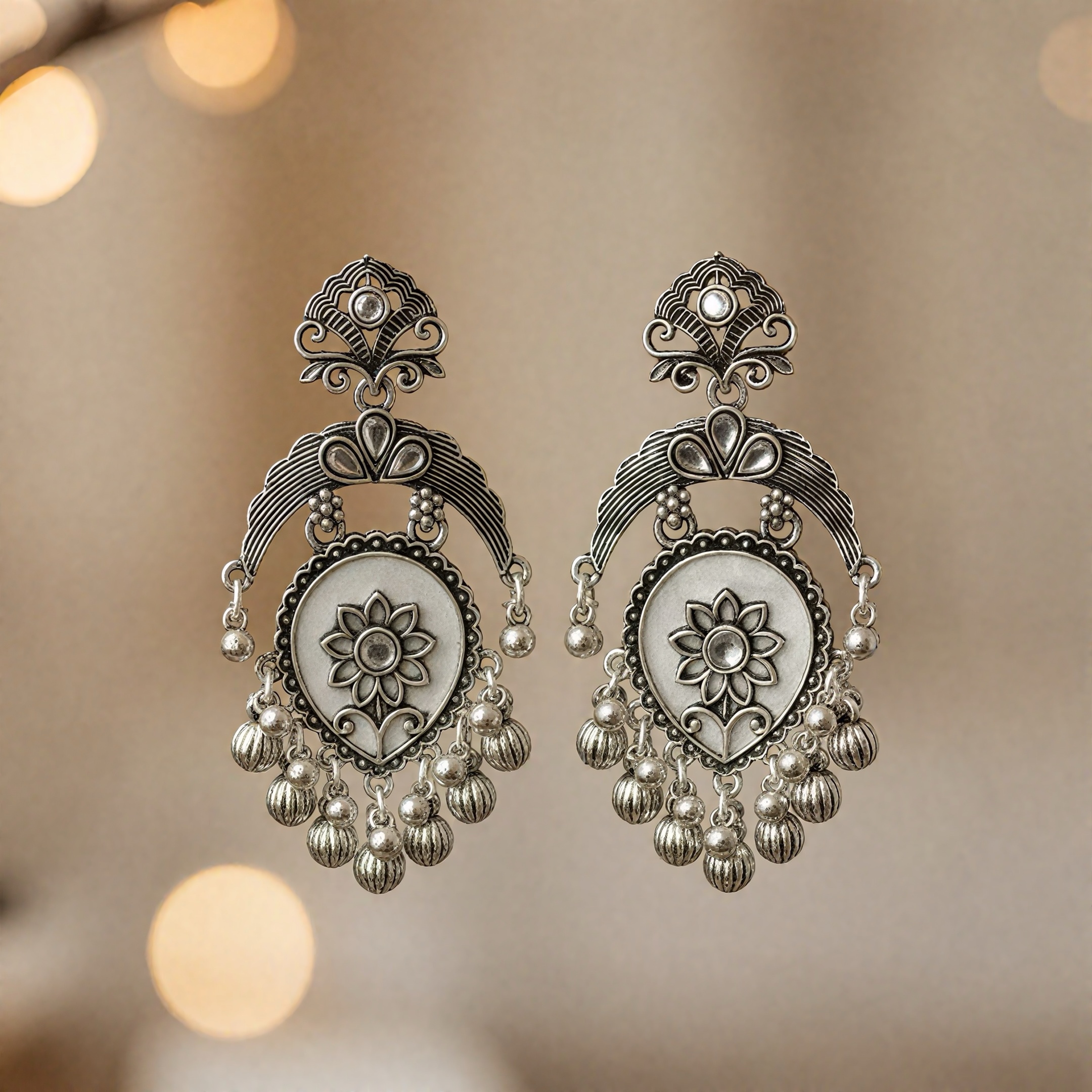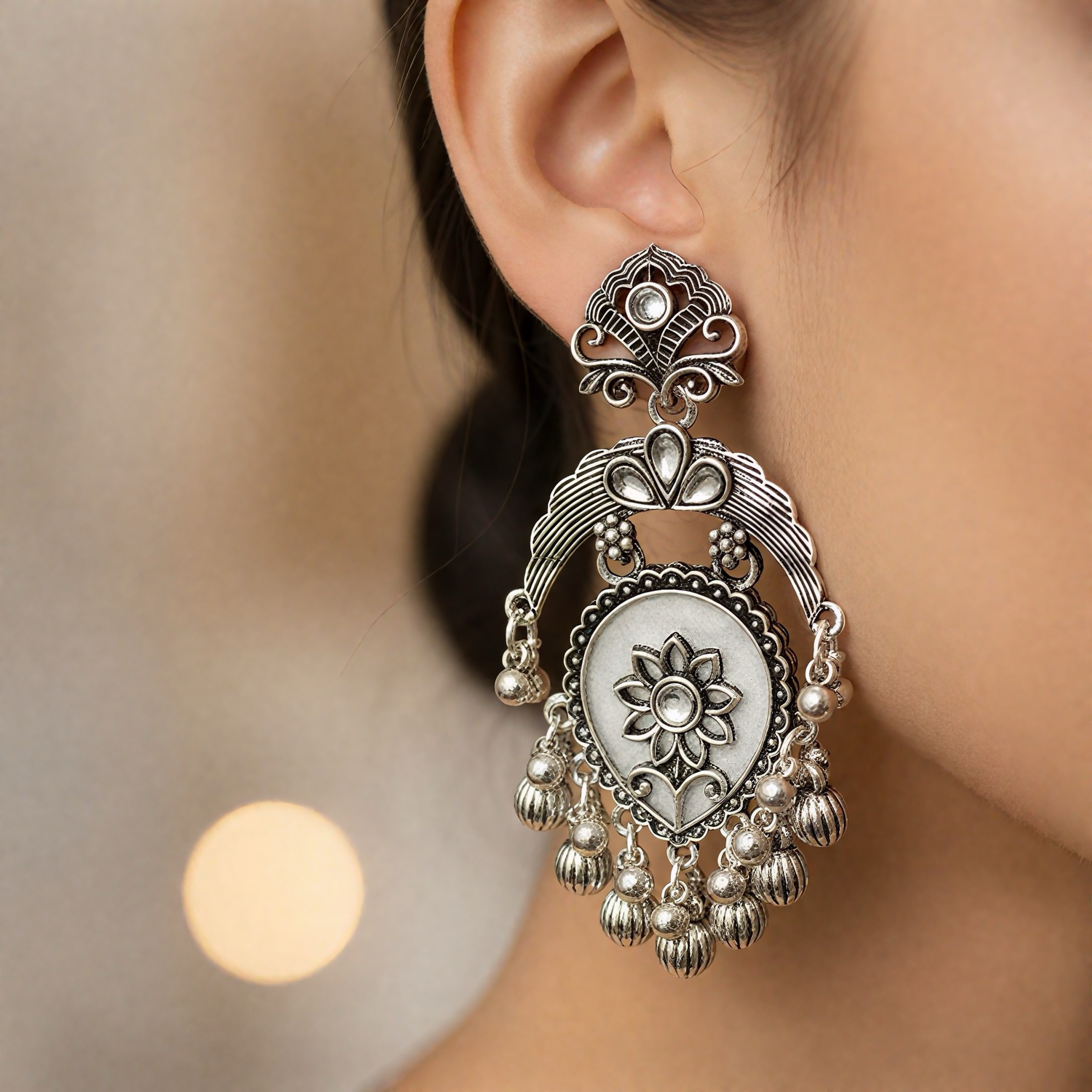 The lower section is finished with multiple dangling oxidised silver ghungroo beads, creating graceful movement and a gentle metallic sound that elevates their traditional appeal.