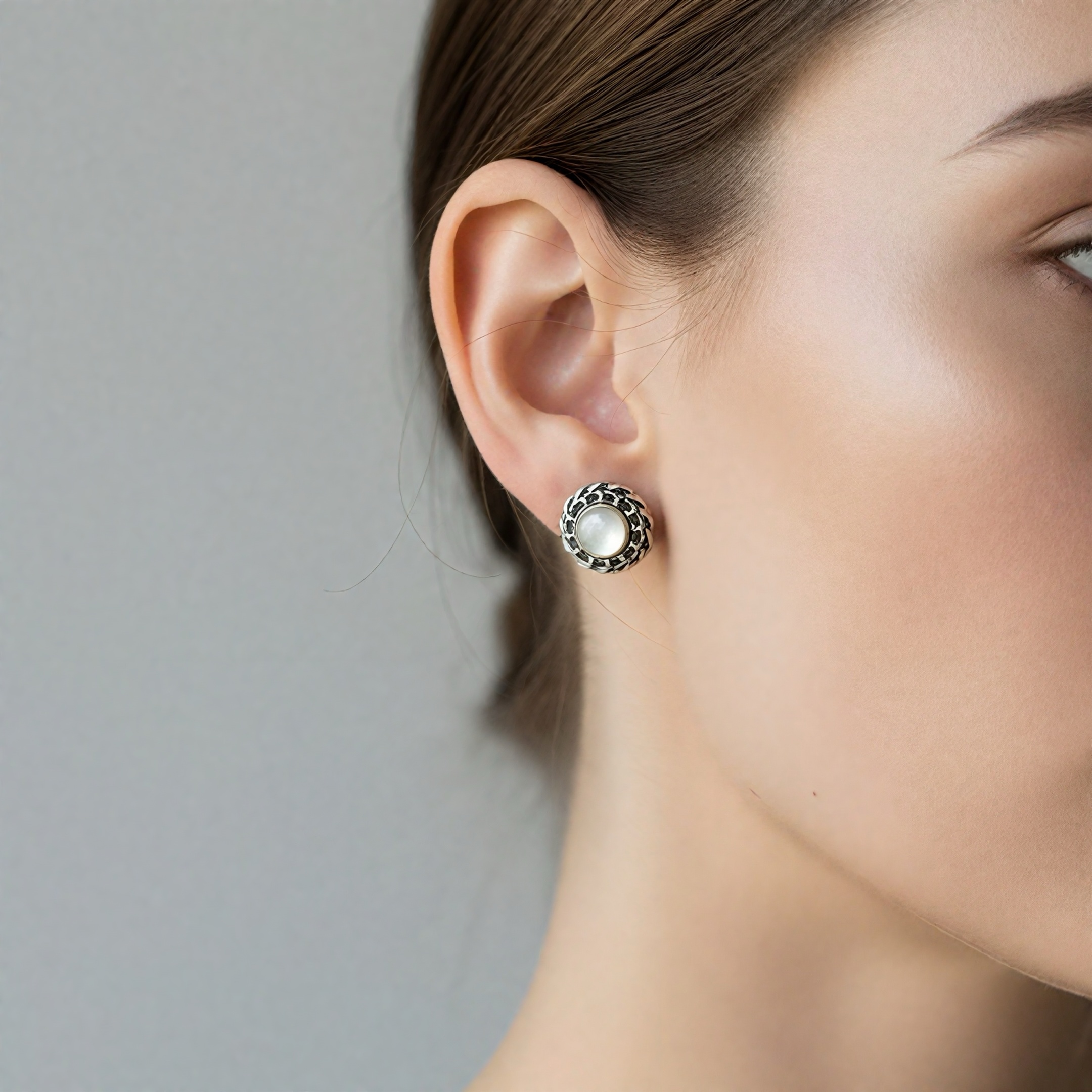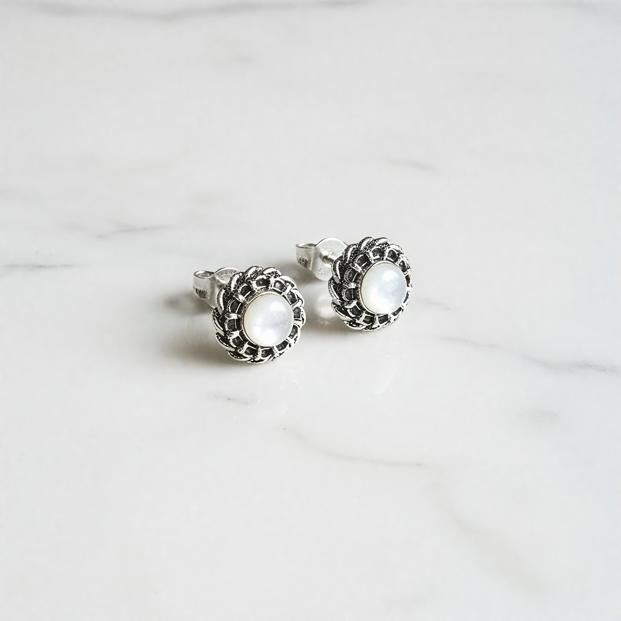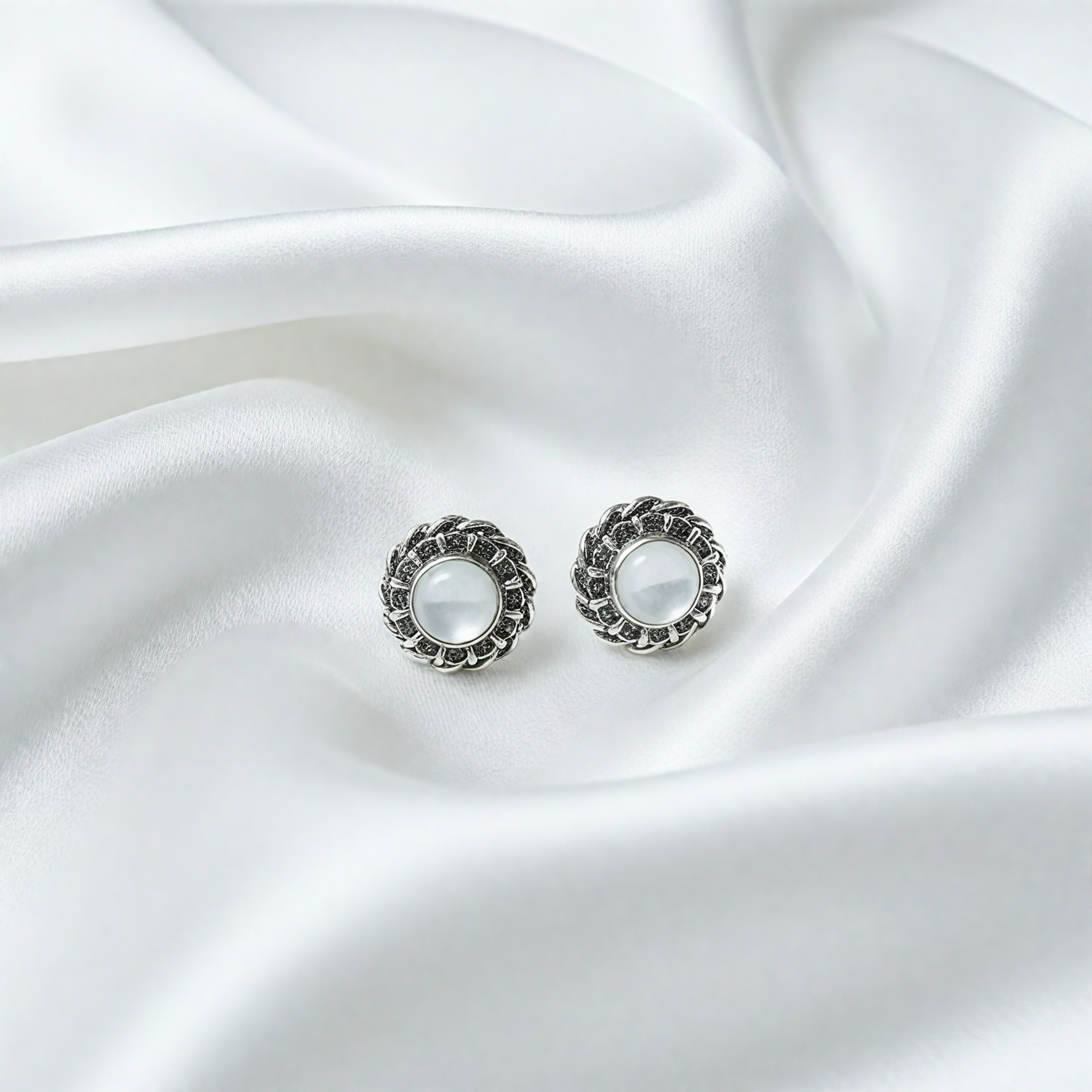 These elegant stud earrings feature a classic vintage-inspired floral design crafted in oxidized silver tones. At the center of each earring sits a smooth, luminous pearl-style stone, creating a timeless and graceful contrast against the intricate petal-like metalwork around it. The detailed edging adds a handcrafted, antique charm that makes these earrings perfect for traditional, ethnic, and everyday classic looks. Lightweight and comfortable for all-day wear, they offer a refined touch of sophistication — ideal for pairing with sarees, kurtis, or formal outfits for a subtle yet elegant statement.