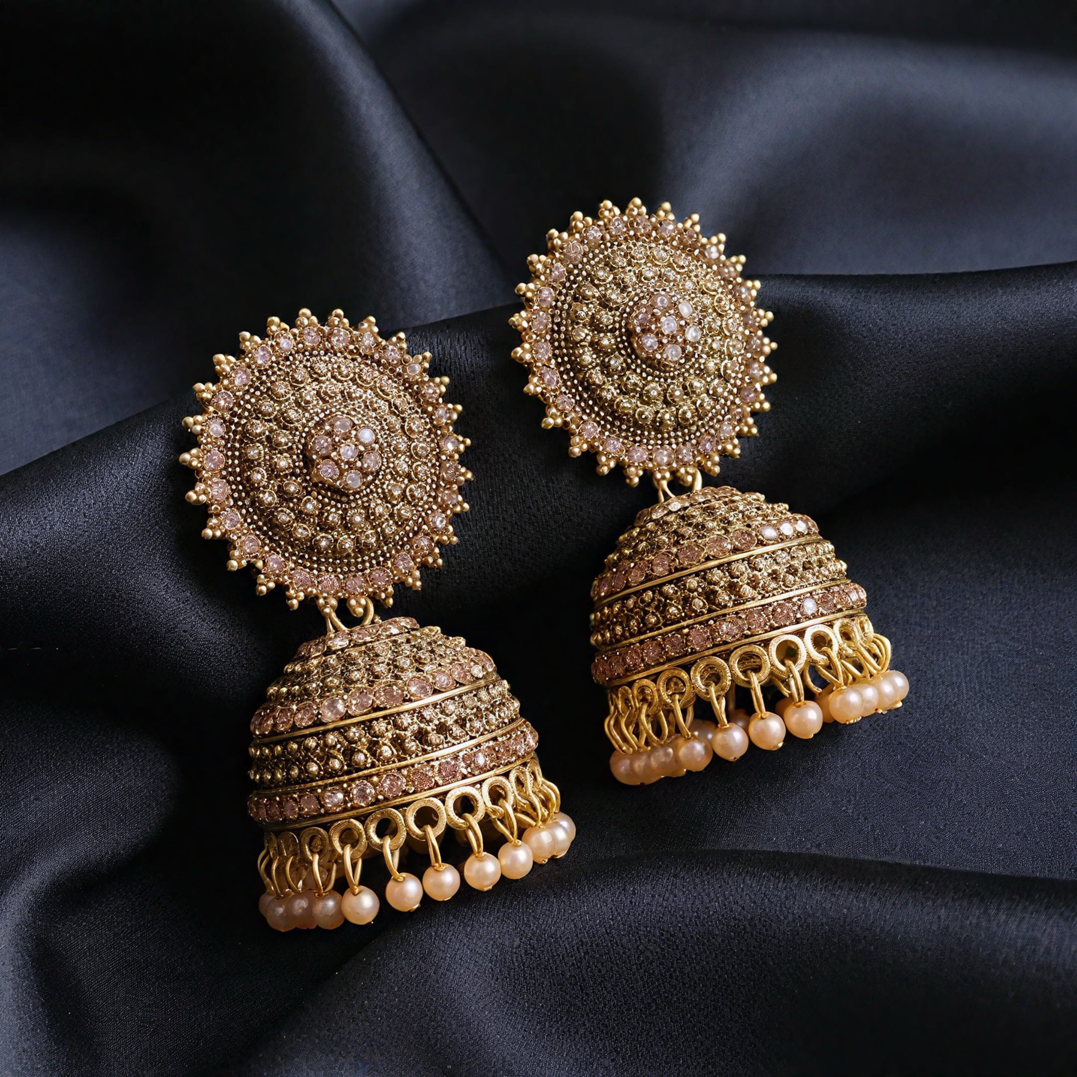 The beautifully layered dome-shaped jhumka is adorned with intricate filigree work and sparkling stone accents, finished with soft pearl drops that add graceful movement and a luxurious touch. The warm antique gold finish enhances its regal appeal, making these earrings a perfect choice for weddings, festive celebrations, and grand occasions.